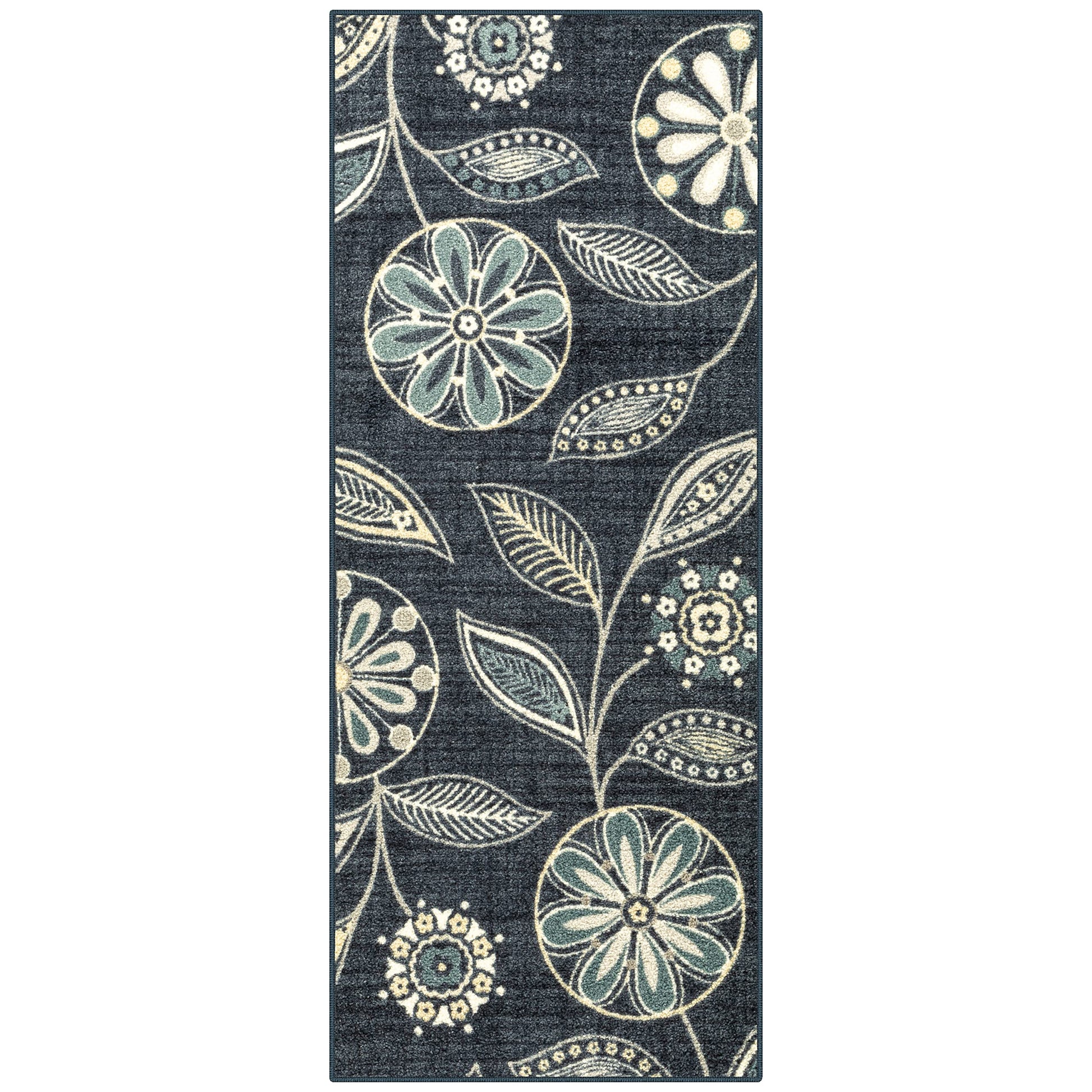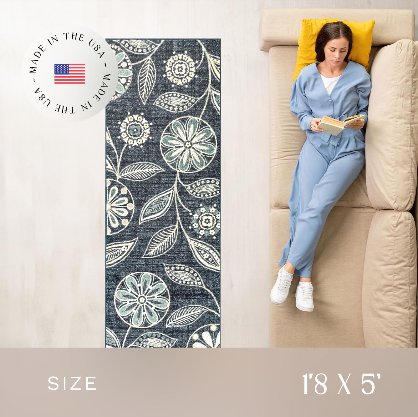 Maples Rugs Reggie Floral Runner Rug - Made in USA - Washable, Non Slip Indoor Carpet for Kitchen, Hallway, and Laundry Room, 1'8 x 5, Persian Blue