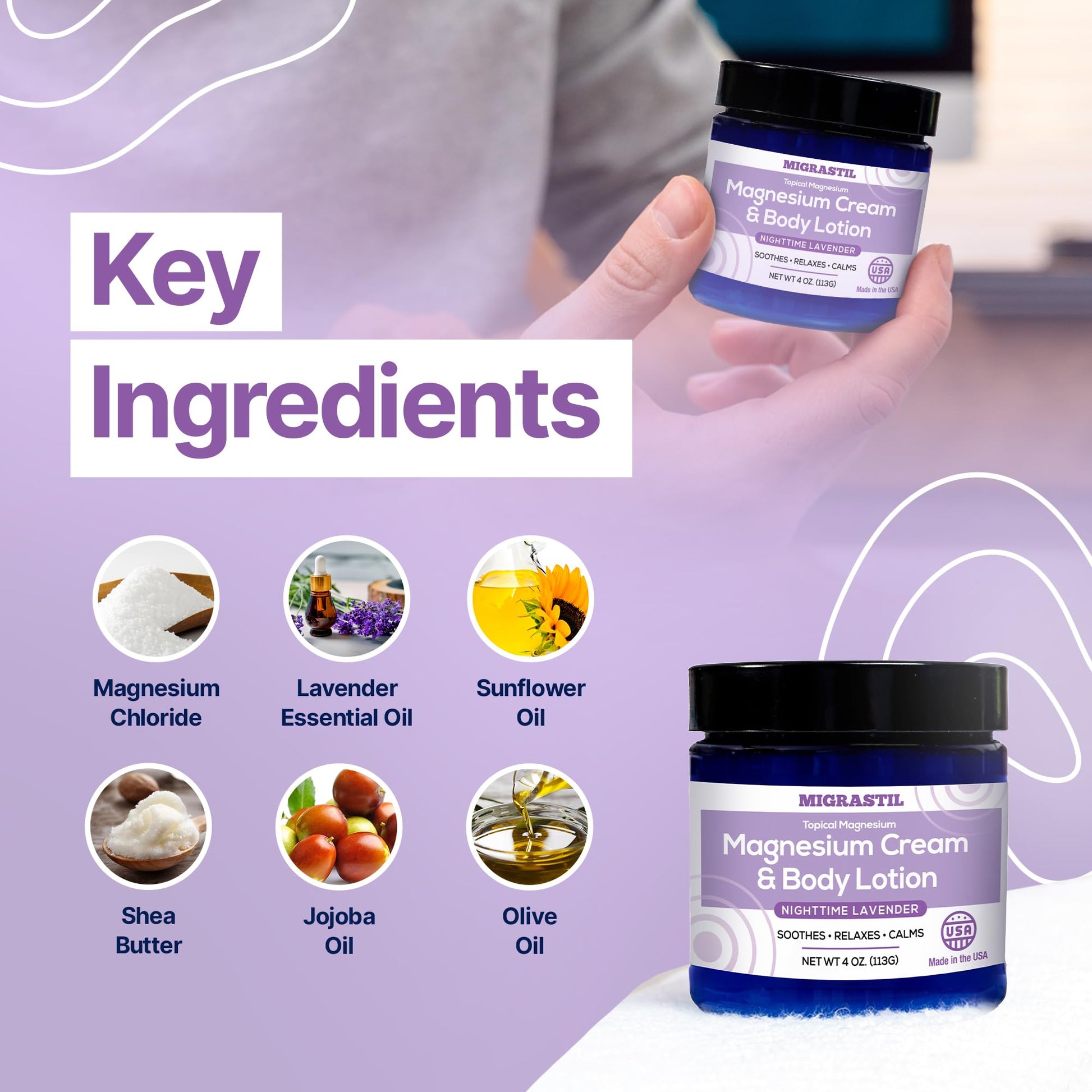 - High Quality: Migrastil Nighttime Lavender Magnesium Cream is made in the USA with the finest ingredients. Natural, Vegan, and Cruelty-Free, it offers a premium blend of magnesium oil for feet and skin rejuvenation.