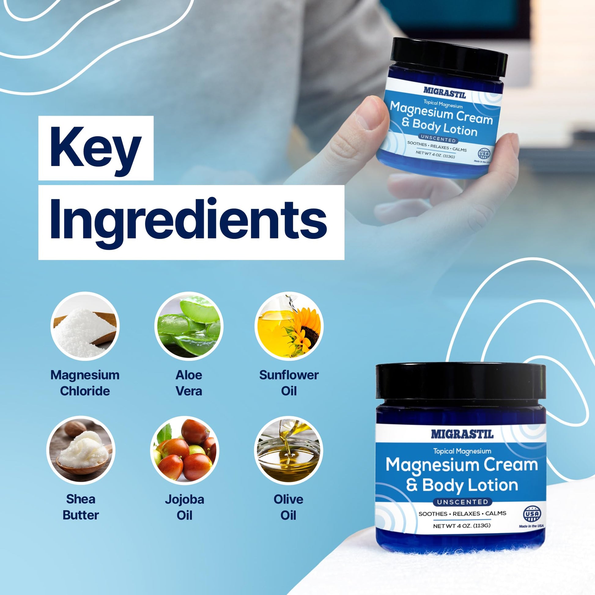 MIGRASTIL Topical Magnesium Cream & Body Lotion 4oz. - Promotes Sleep and Soothing Relief for Sore Muscles, Leg Cramps, Etc. Made in The USA.