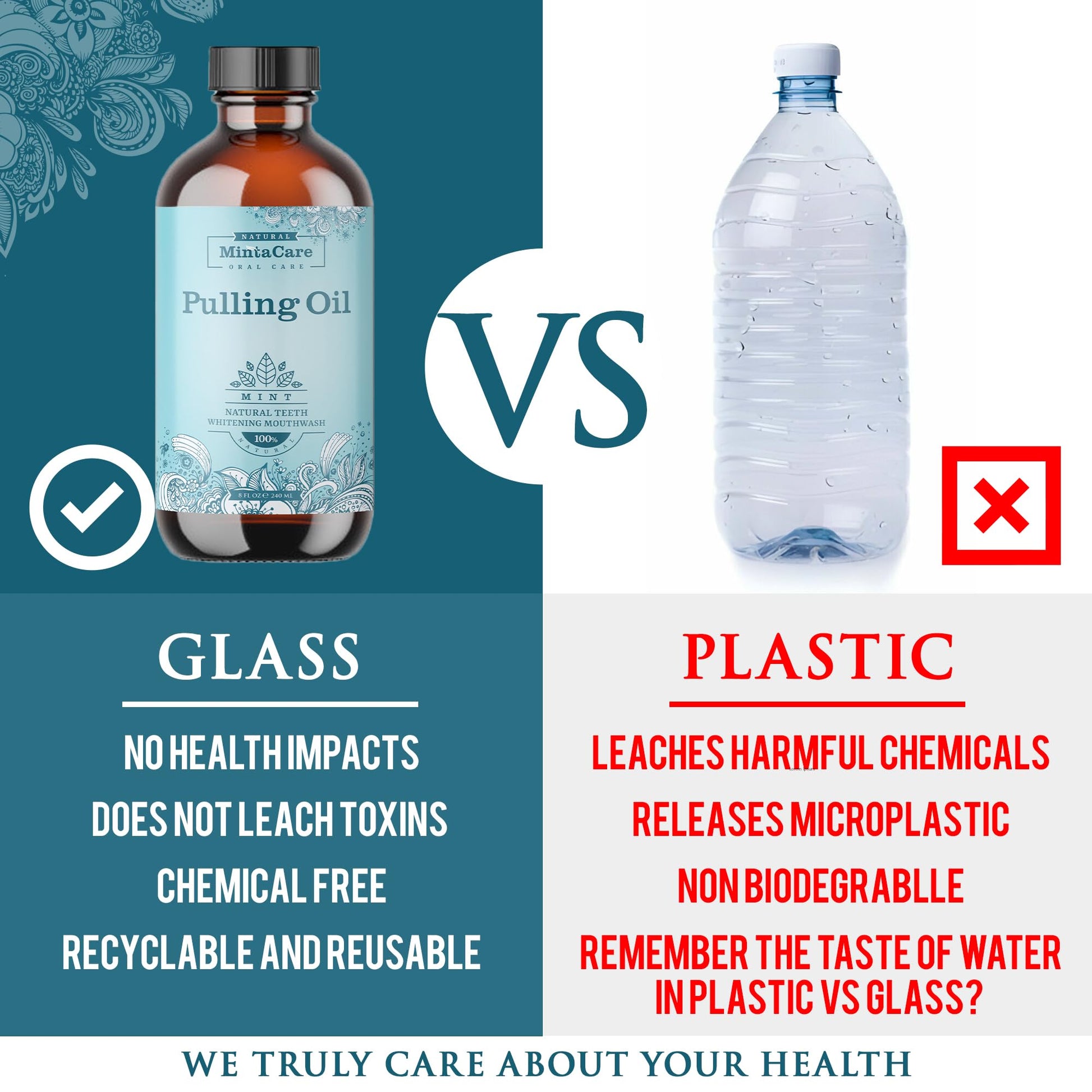 - Opting for glass packaging isn't just a sustainability choice; it's a health-conscious one. Unlike plastic in other brands, which can leach toxins, glass maintains the purity of our pulling oil, ensuring it remains free from harmful contaminants, prioritizing your well-being and peace of mind.