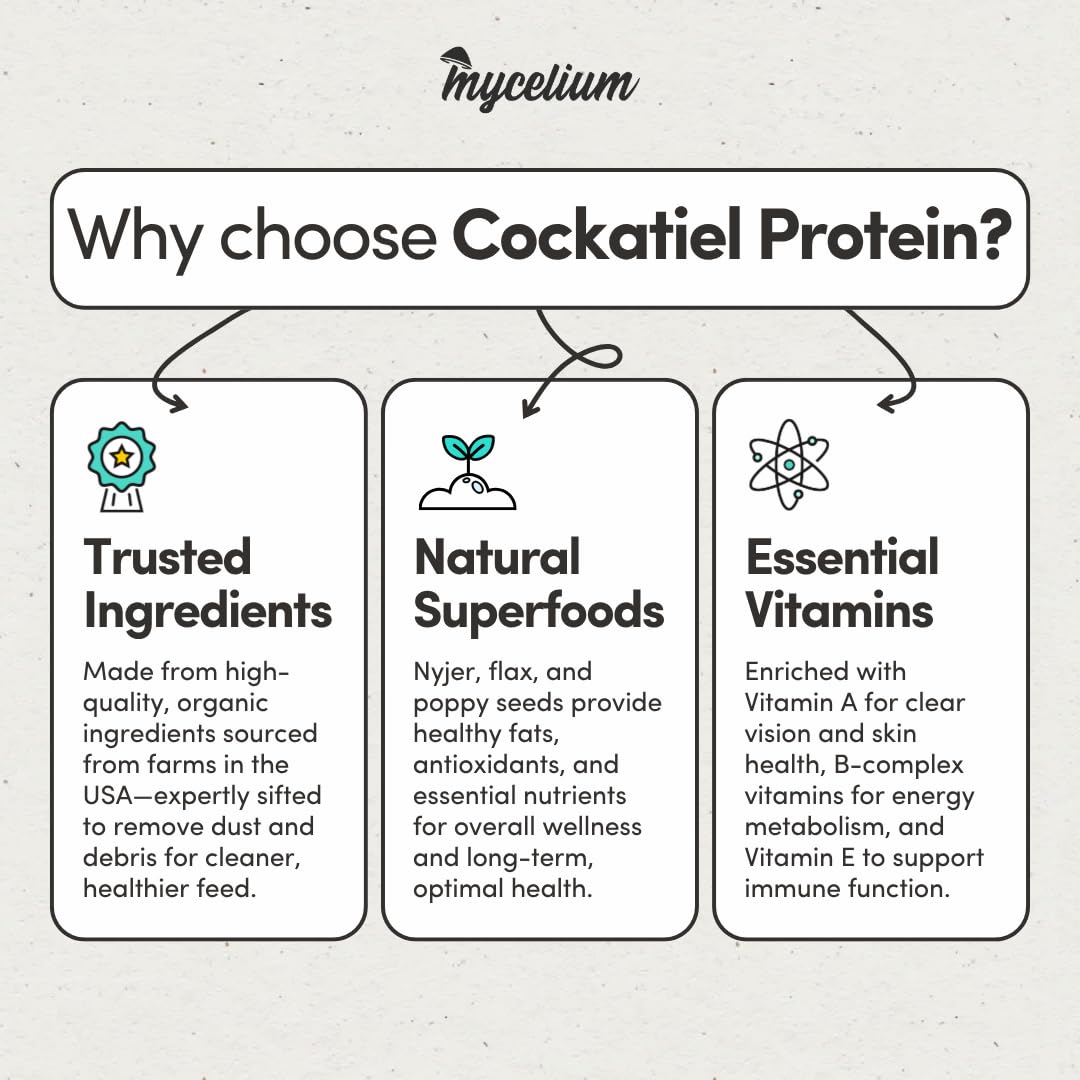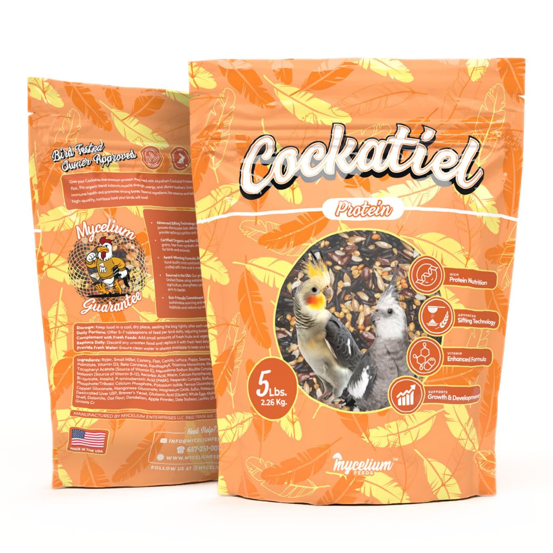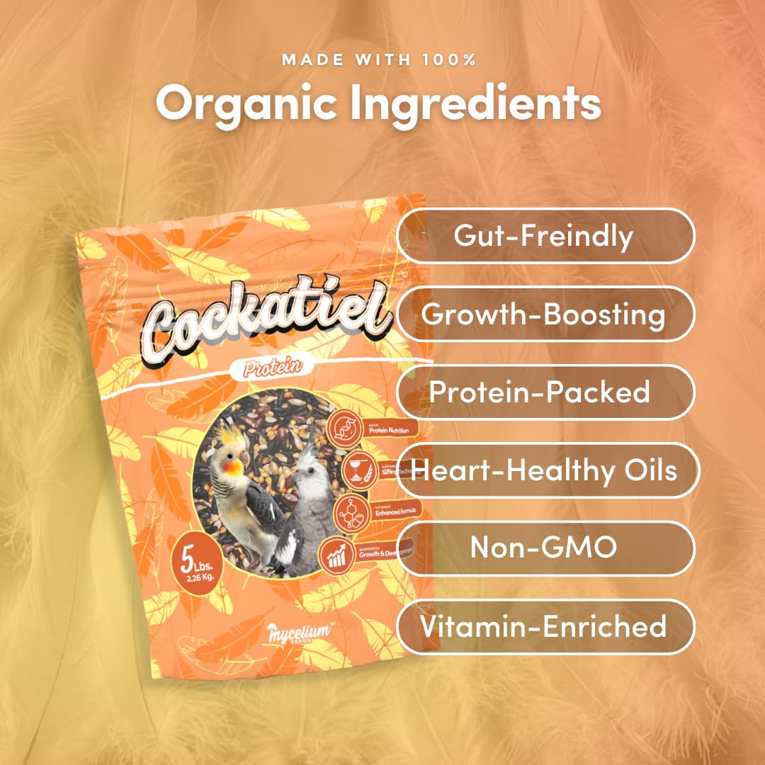 Mycelium Organic Cockatiel Protein Feed (5 LB Bag) | High-Protein, High-Fat Bird Seed for Energy, Growth, & Development | Seed & Superfood Blend for Cockatiels | Non-GMO, Made in USA