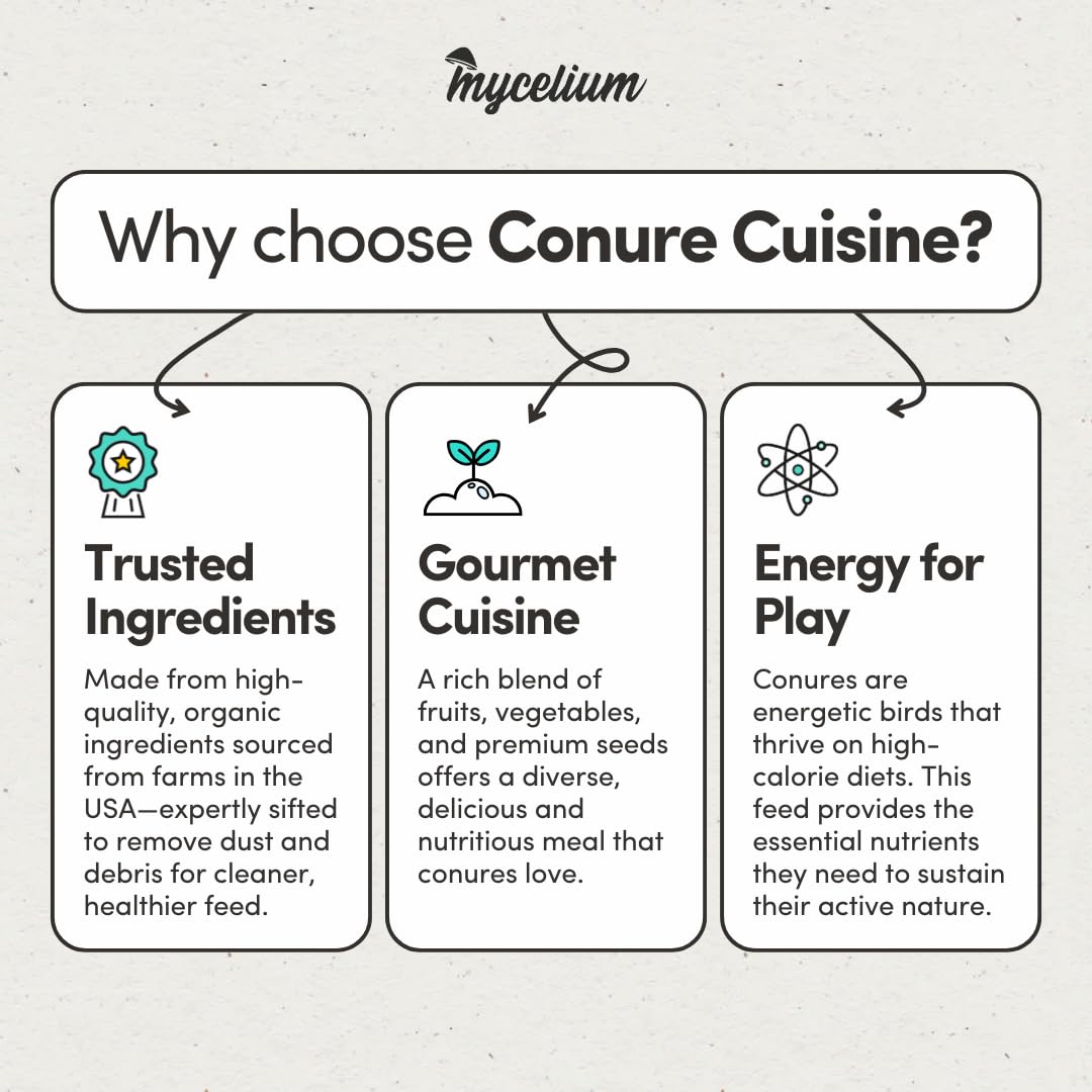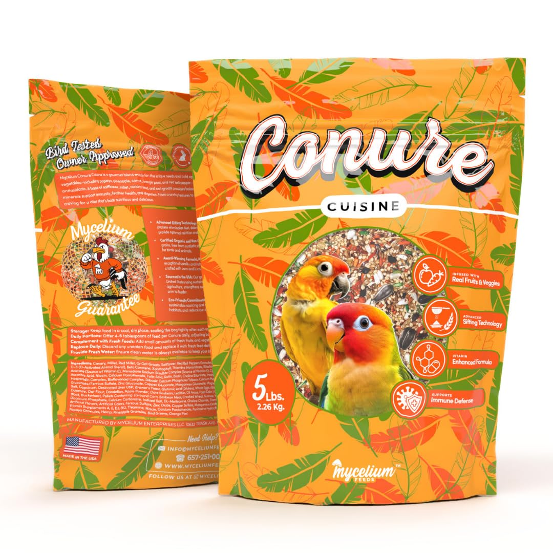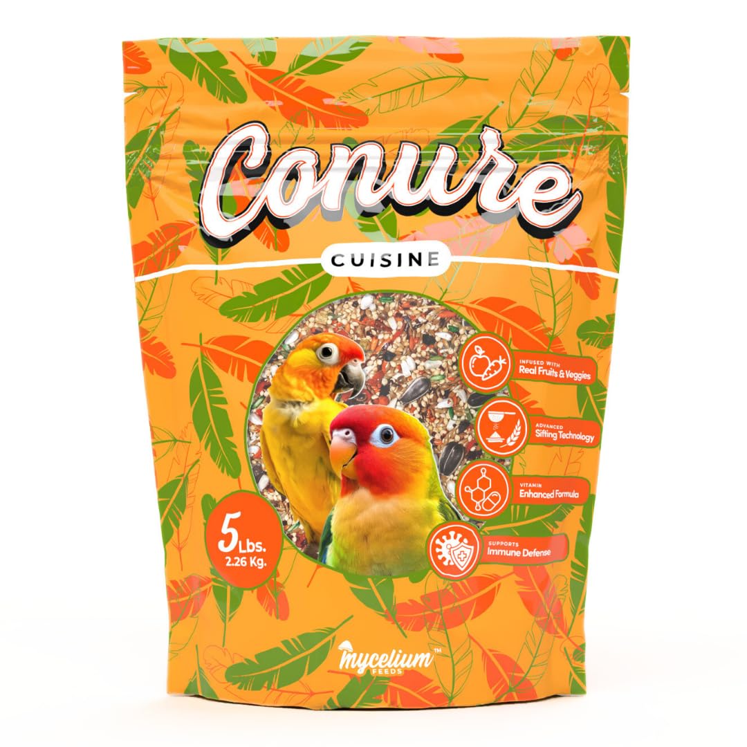 Mycelium Organic Conure Cuisine (5 LB Bag) | Fruit & Veggie Bird Seed w/Added Vitamins | Balanced Daily Nutrition for Immunity & Feather Health | Non-GMO, No Fillers or Additives, Made in USA