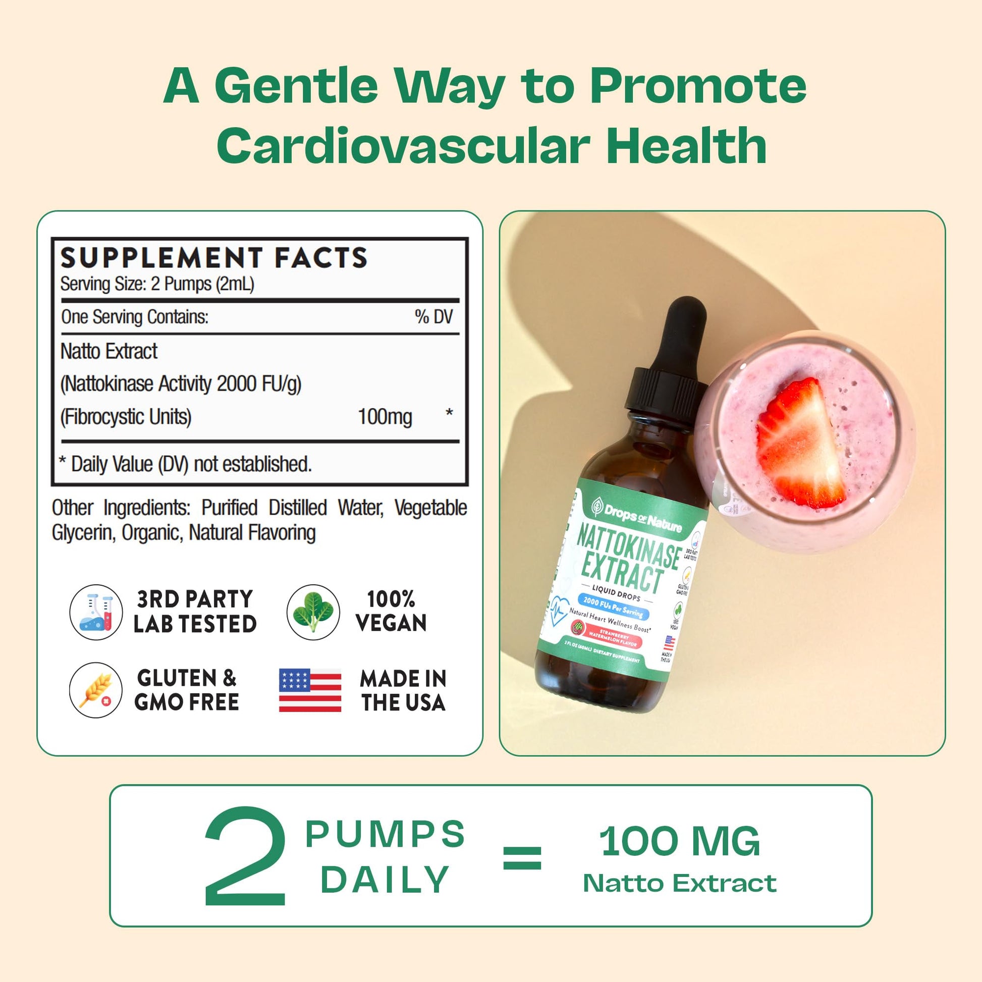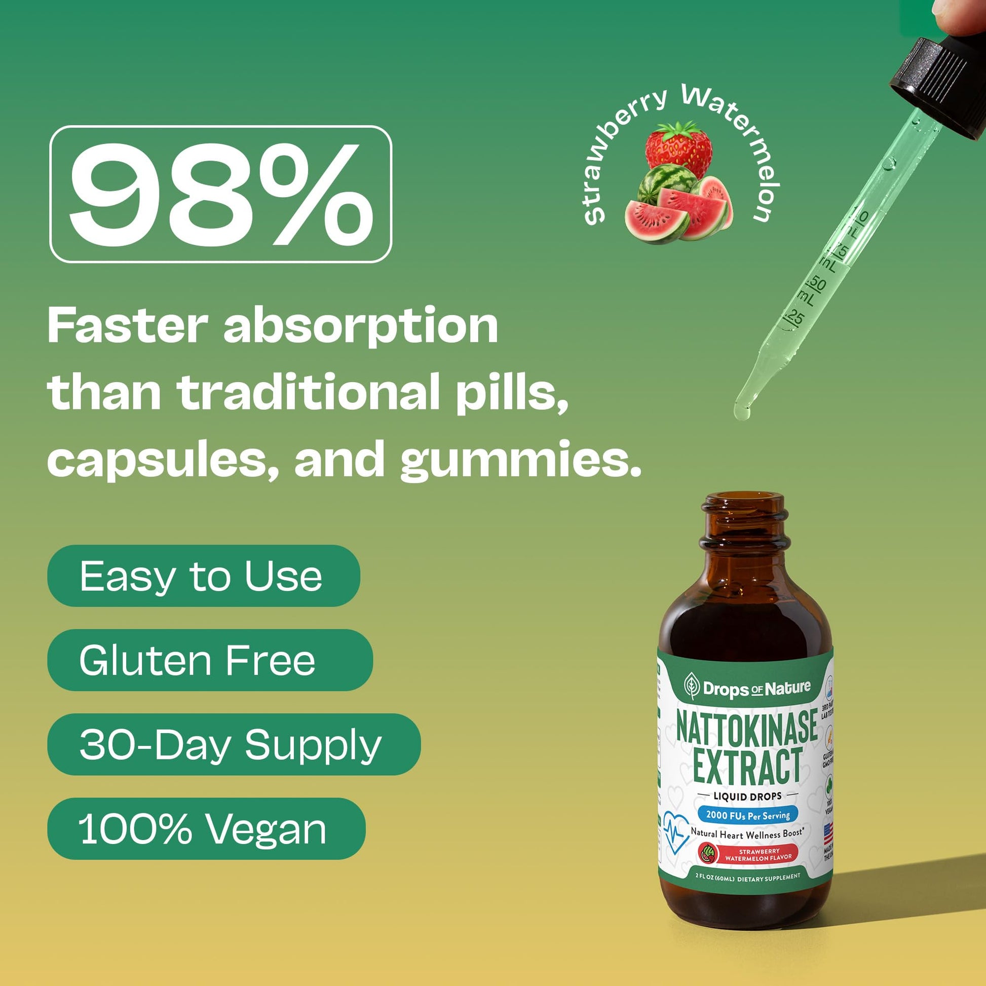 Nattokinase Supplement Liquid Drops – Made of Nattokinase 2000 FU Extract – Vegan, GMO-Free – Liquid Alternative to Natto Veggie Caps – Aids in Maintaining Heart Wellness (Strawberry Watermelon, 60mL)