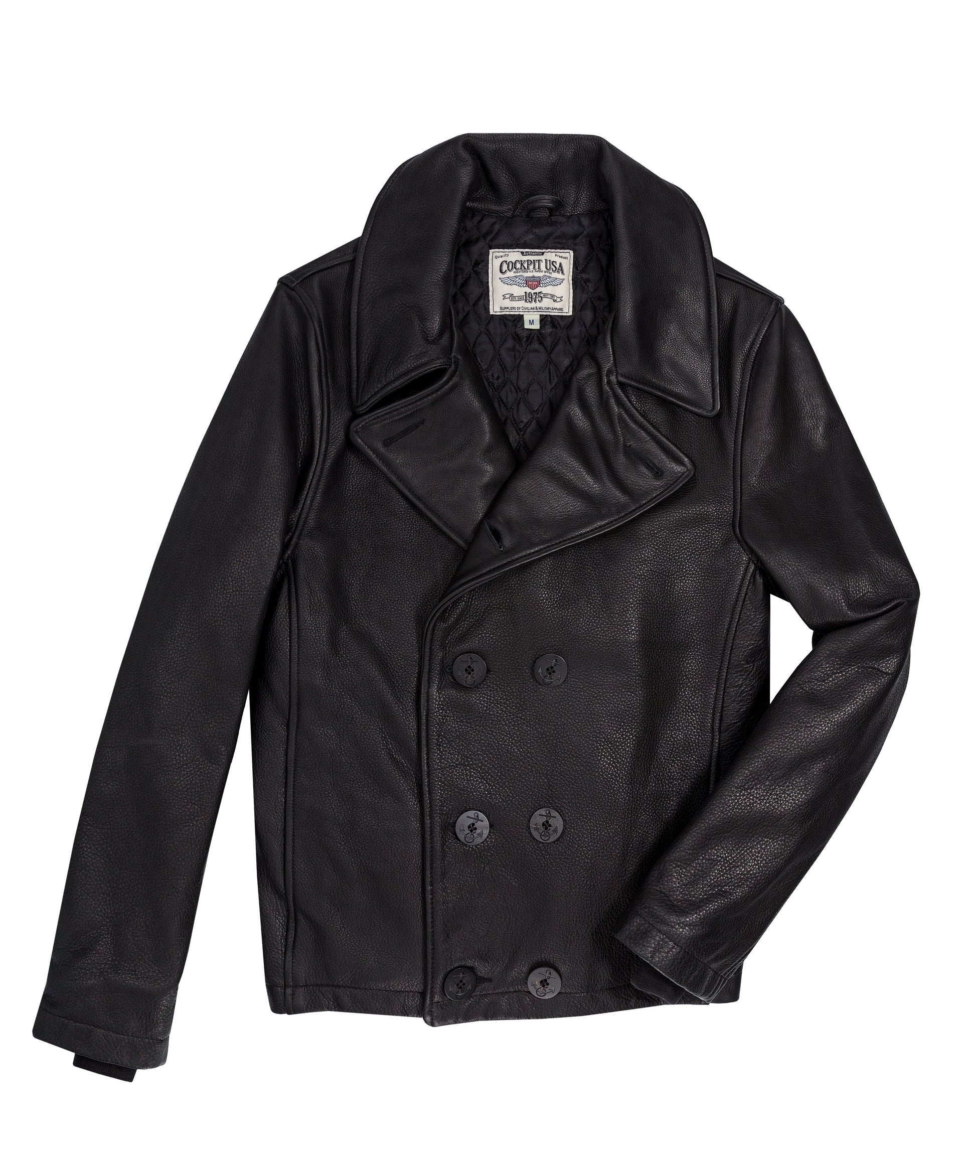 Cockpit USA’s oiled leather deer tanned Naval Short Leather peacoat pays tribute to the British Reefer Coat; a shortened peacoat made for ease of maneuverability, allowing sailors to climb the ropes of their ships. Updating this classic style with a modern edge, our craftsman carefully chose the most durable and luxurious calfskin leather to bring this style up to date. Add this men's naval peacoat to your cart today!