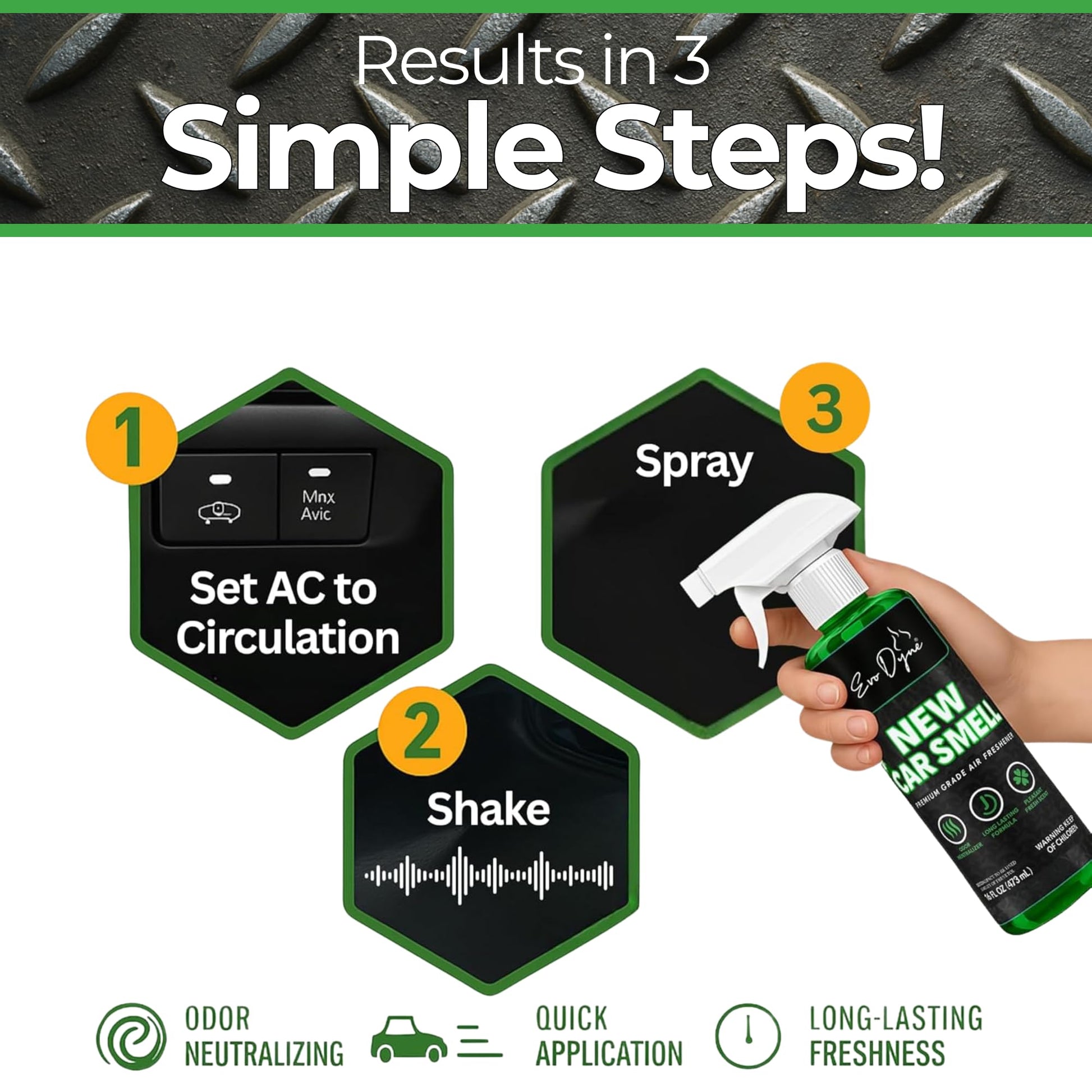 - Evo Dyne’s New Car Fresheners: Our 16oz car air freshener new car scent is formulated with unique fragrances that help bring back that new car smell! This car air freshener spray can be used in all kinds of vehicles to eliminate odors & is proudly made in the U.S.A.