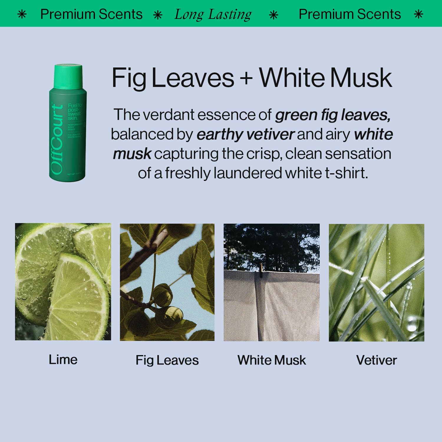 - Fresh, premium scents for men and women: Confidently apply OffCourt body spray generously, with a 2 pack of Fresh Citron and Driftwood and Fig Leaves and White Musk scent that will last all day