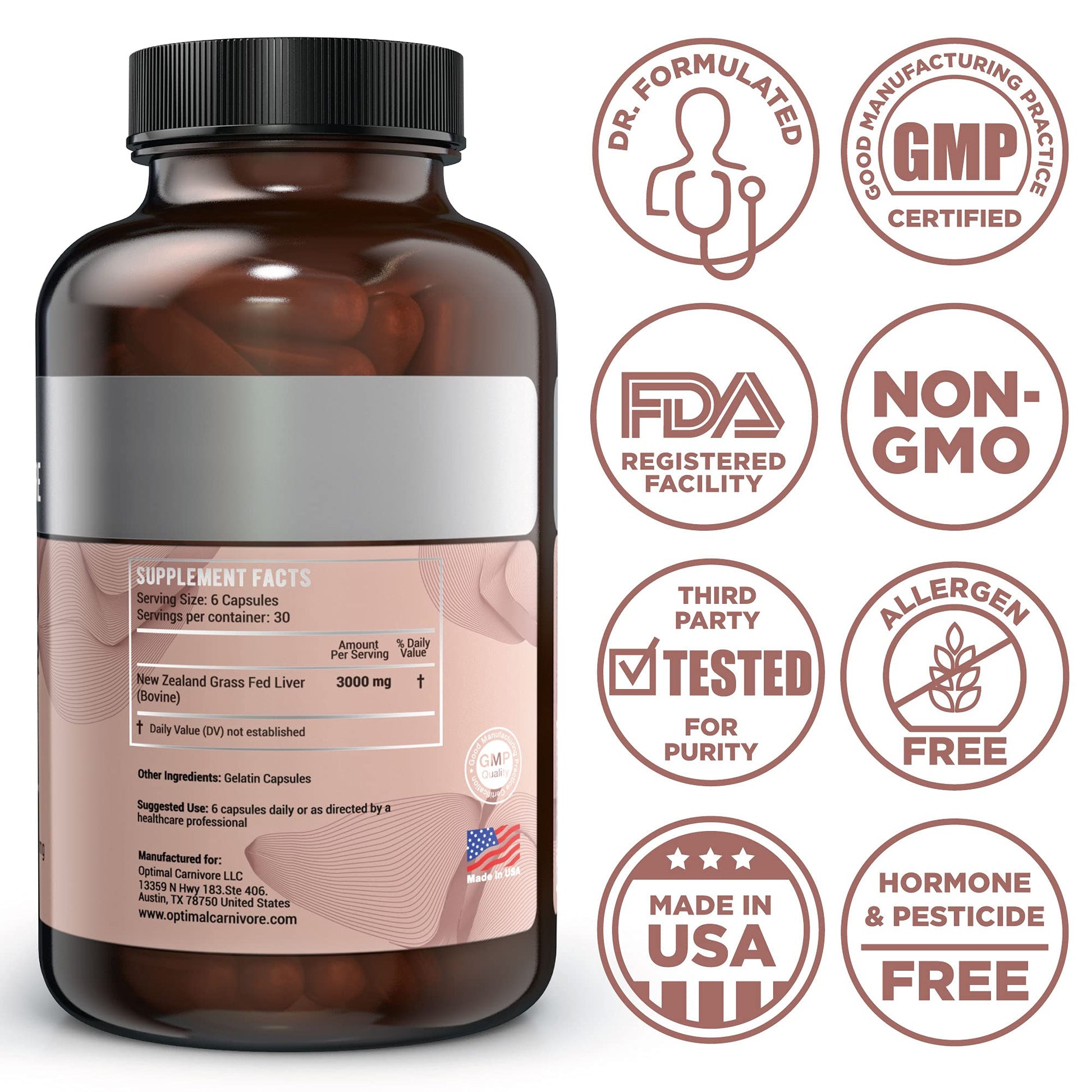 Optimal Carnivore Grass Fed Beef Liver Capsules, Freeze Dried in Convenient Pills, 180 Capsules, Desiccated Supplement