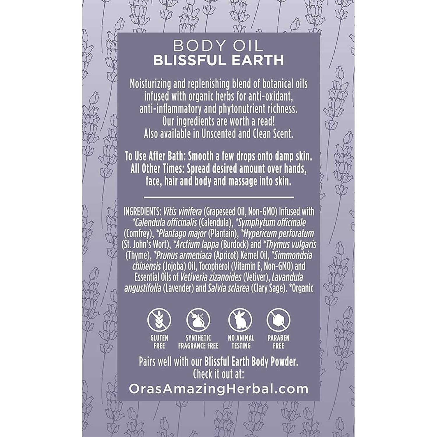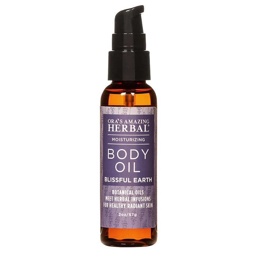 - Ora’s Amazing Herbal Blissful Earth Body Oils for women and men, is an effective, well absorbing, moisturizing oil for body, hands, and is a wonderful bath oil. Blissful Earth Body Oil smells Amazing while supporting optimal skin health. We love this product because it is deeply moisturizing and contains wonderful essential oils for relaxation.