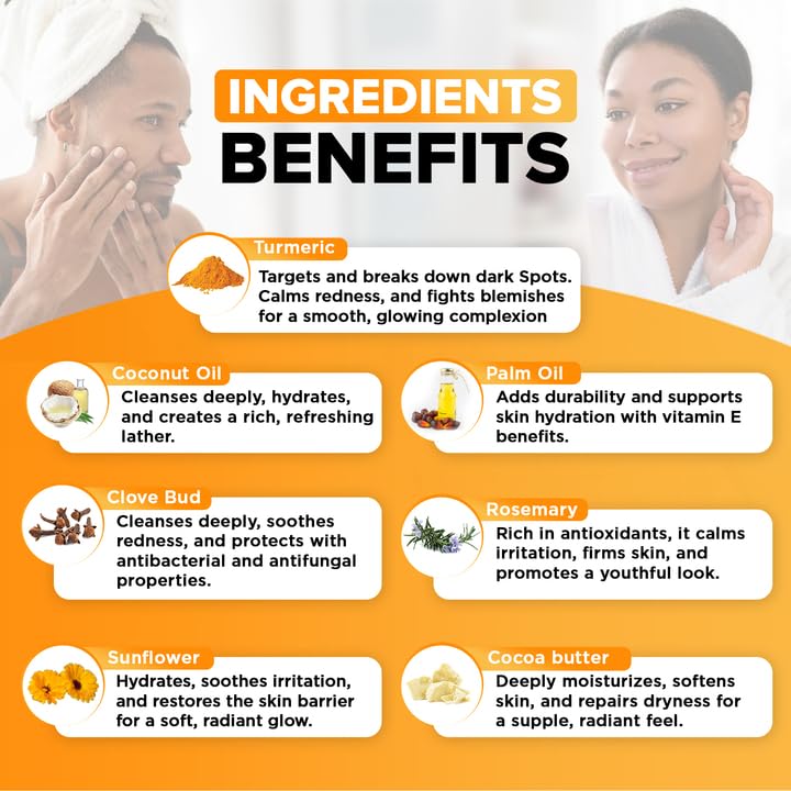 - Hydrating and Moisturizing: Our turmeric soap bar is infused with turmeric and clove, combined with nourishing natural oils and butter sourced from botanicals. Turmeric Soap for Dark Spots specifically formulated for all skin types.
