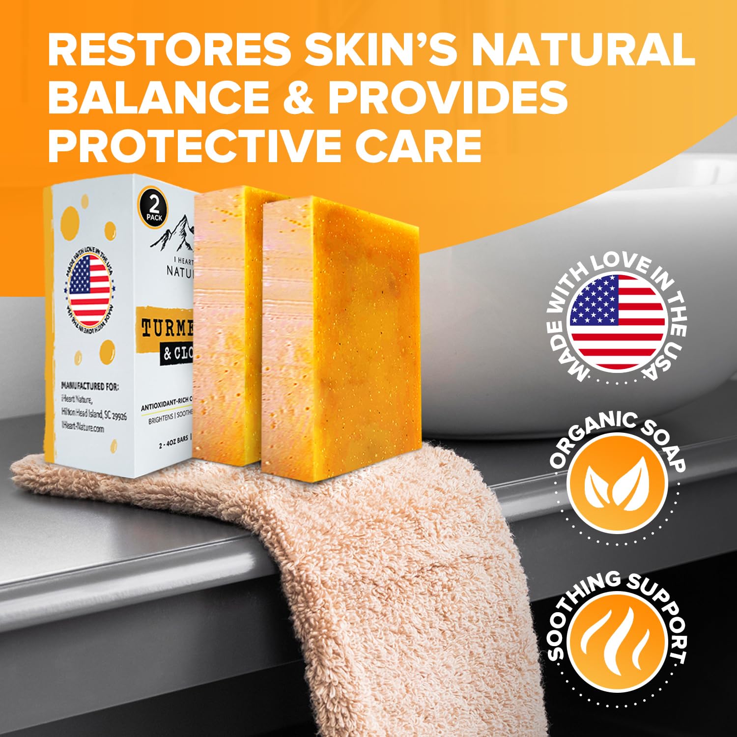 Organic Turmeric Soap for Dark Spots & Acne with Clove Bud (2 Packs) – Face & Body Bar – Rich, Creamy Lather for Natural Skin Glow Aromatherapy
