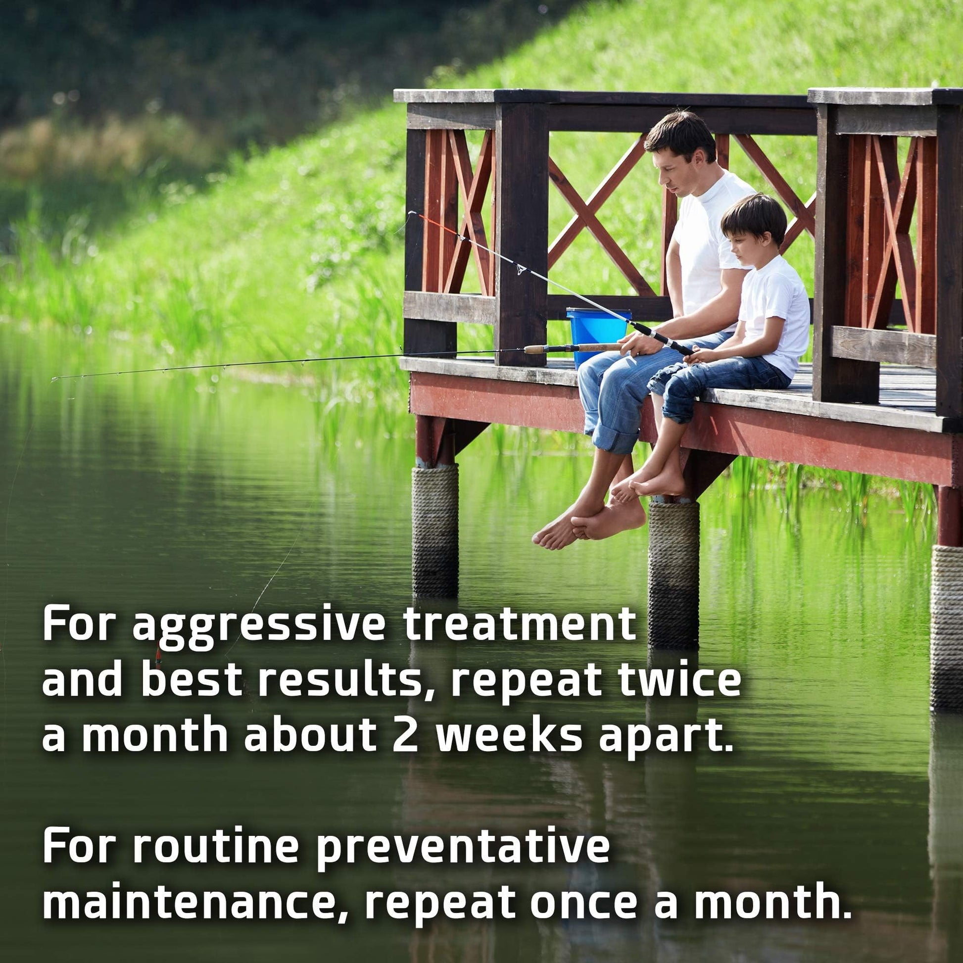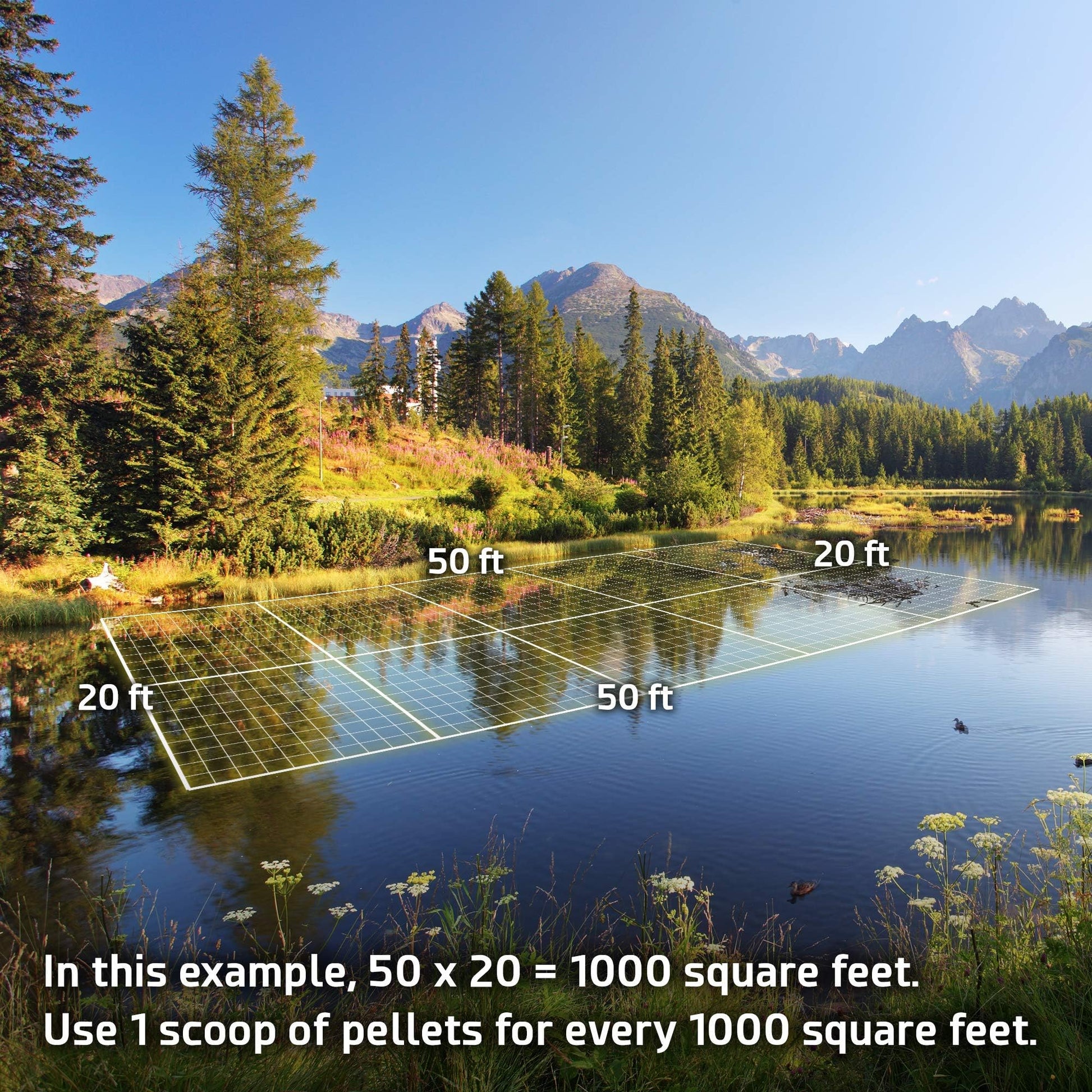 - πΏ HOW MUCH DOES 1 BUCKET TREAT? β This bucket contains 5 pounds of pellets, or 10 scoops, and will treat 50 feet of shoreline for up to 10 months of regular maintenance or 5 months of aggressive treatment. Full instructions are included, and our customer service responds within 24 hours if you have additional questions.