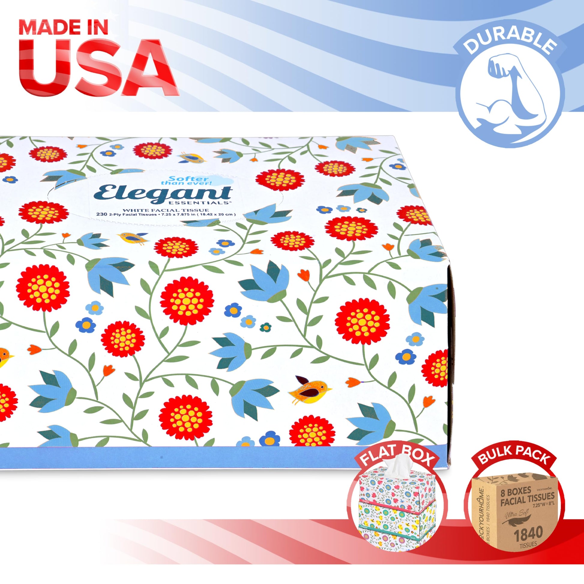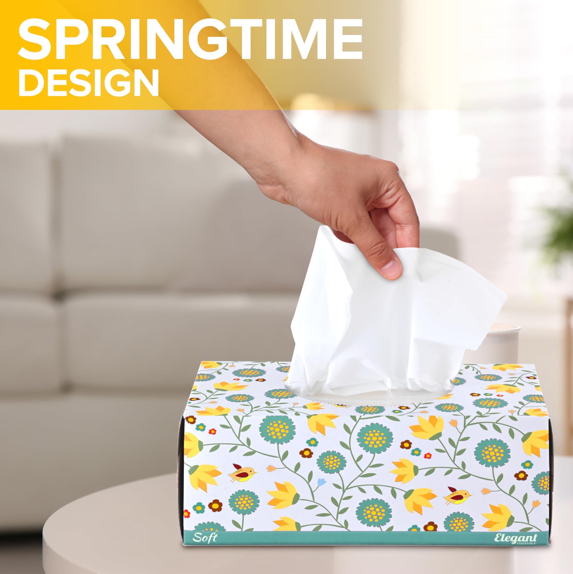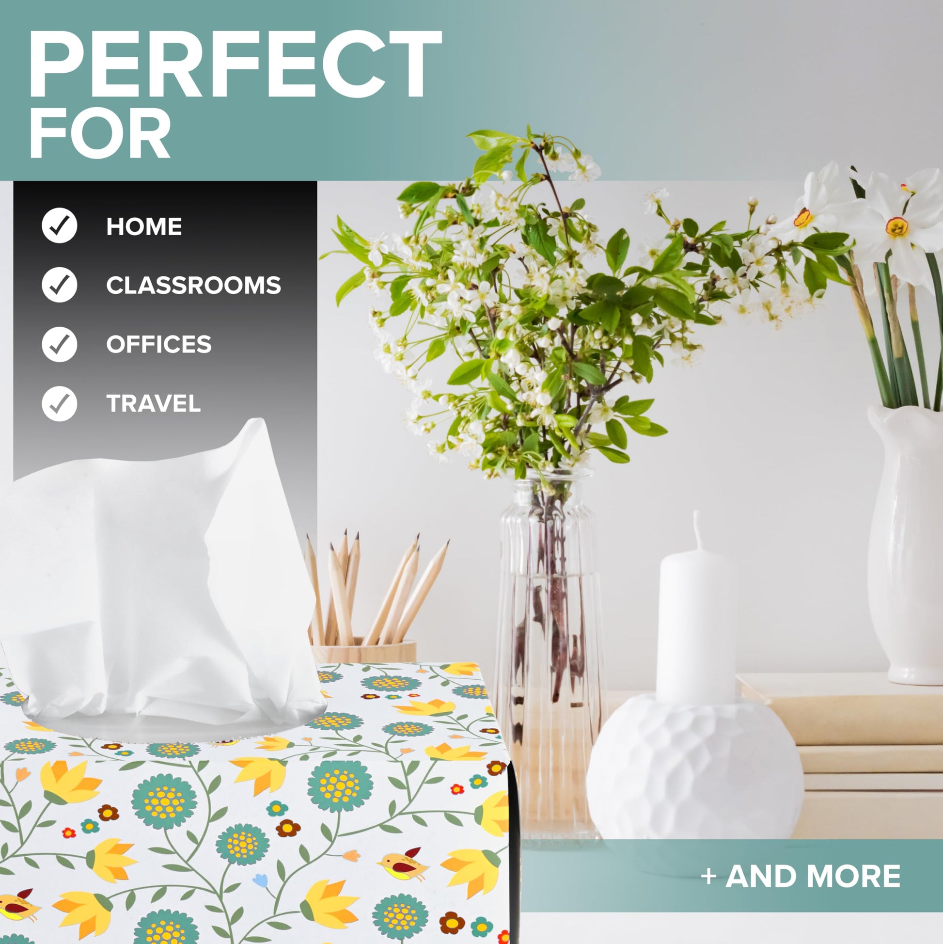 • Spring Cheer: More than just practical, each tissue box boasts a delightful floral design that adds a touch of springtime charm to any room. Even if spring allergies have got you down, our facial tissue boxes will be sure to brighten your day!