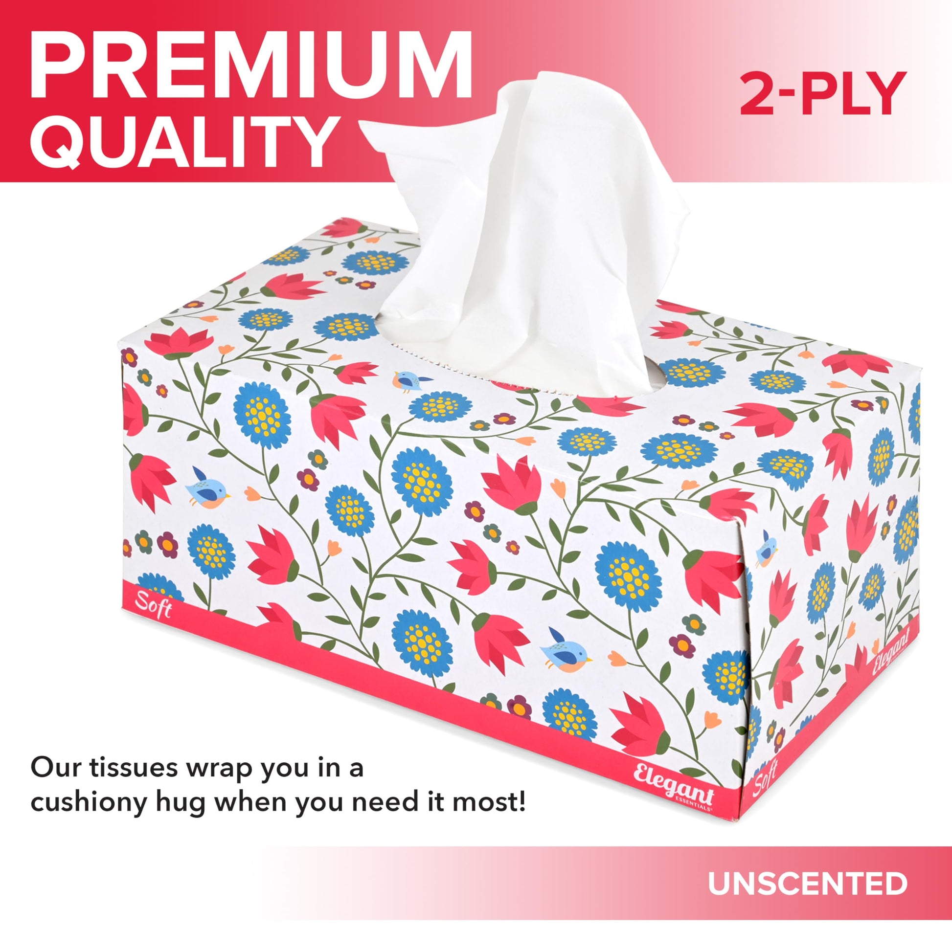 • Quality Materials: Treat yourself to the soft, cushiony hug of our 2-ply, unscented face tissues. Gentle on the skin, our facial tissue provides soothing comfort for your needs, whether it's a runny nose, a happy tear, or simply wiping away makeup.