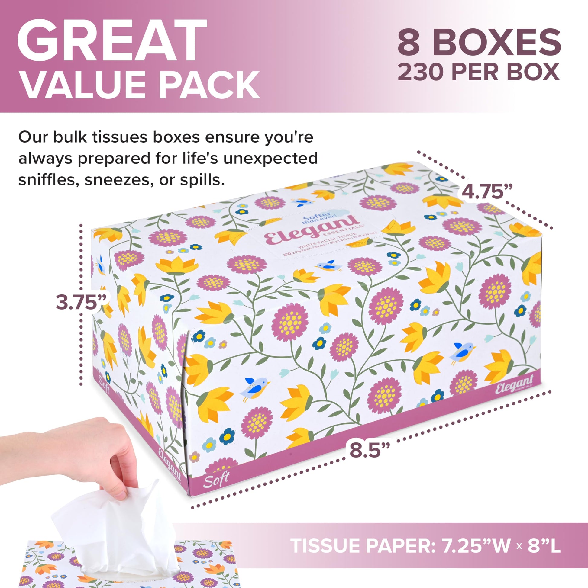 • Great Value: Our bulk tissue pack includes 8 boxes of 230 count tissues, for a total of 1,840 tissues! Each tissue paper measures 7.25" x 8"L, while each box of tissues measures 8.5"w x 4.75"d x 3.75"H.