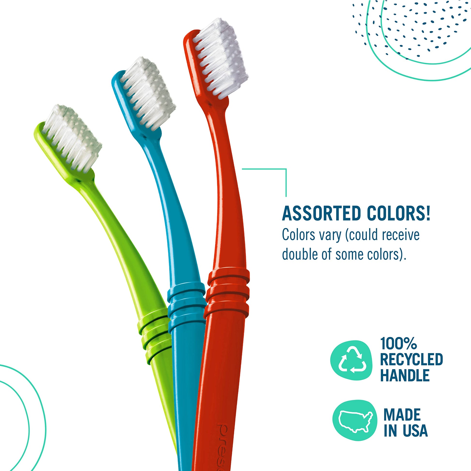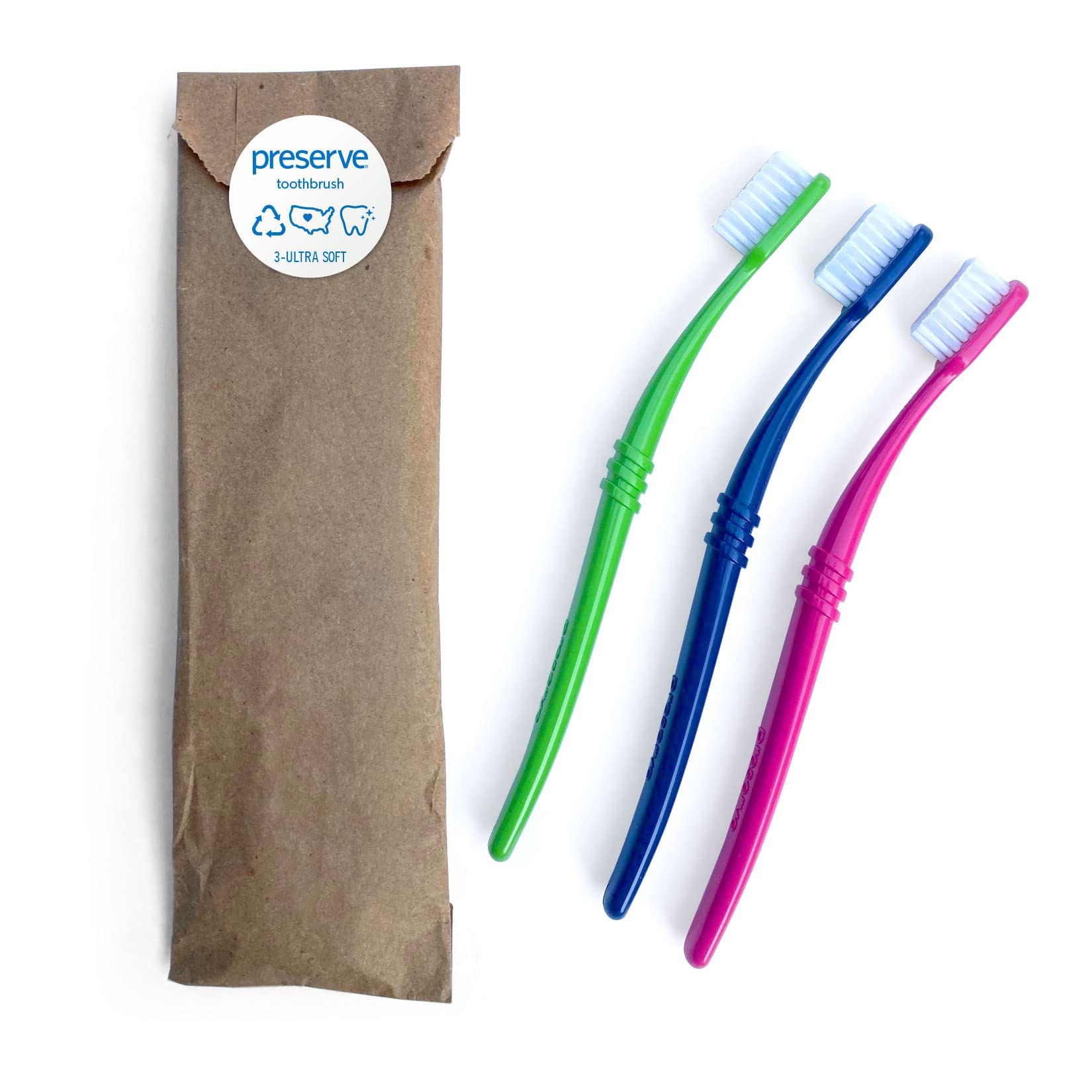 Preserve Eco Friendly Adult Toothbrushes, Made in The USA from Recycled Plastic, Lightweight Paper Packaging, Ultra Soft Bristles, Colors Vary, 3 Count
