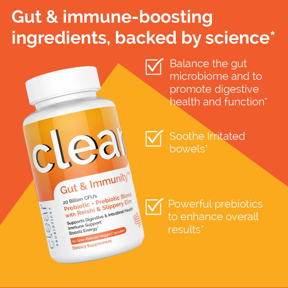 - A POWERFUL FORMULA DESIGNED WITH PROVEN INGREDIENTS TO KEEP YOU STRONG - Along with the two carefully chosen strains of probiotics, Clear Probiotics Gut and Immunity also contains Slippery Elm to soothe bowel irritation, and Reishi to boost immune function and cardiovascular health