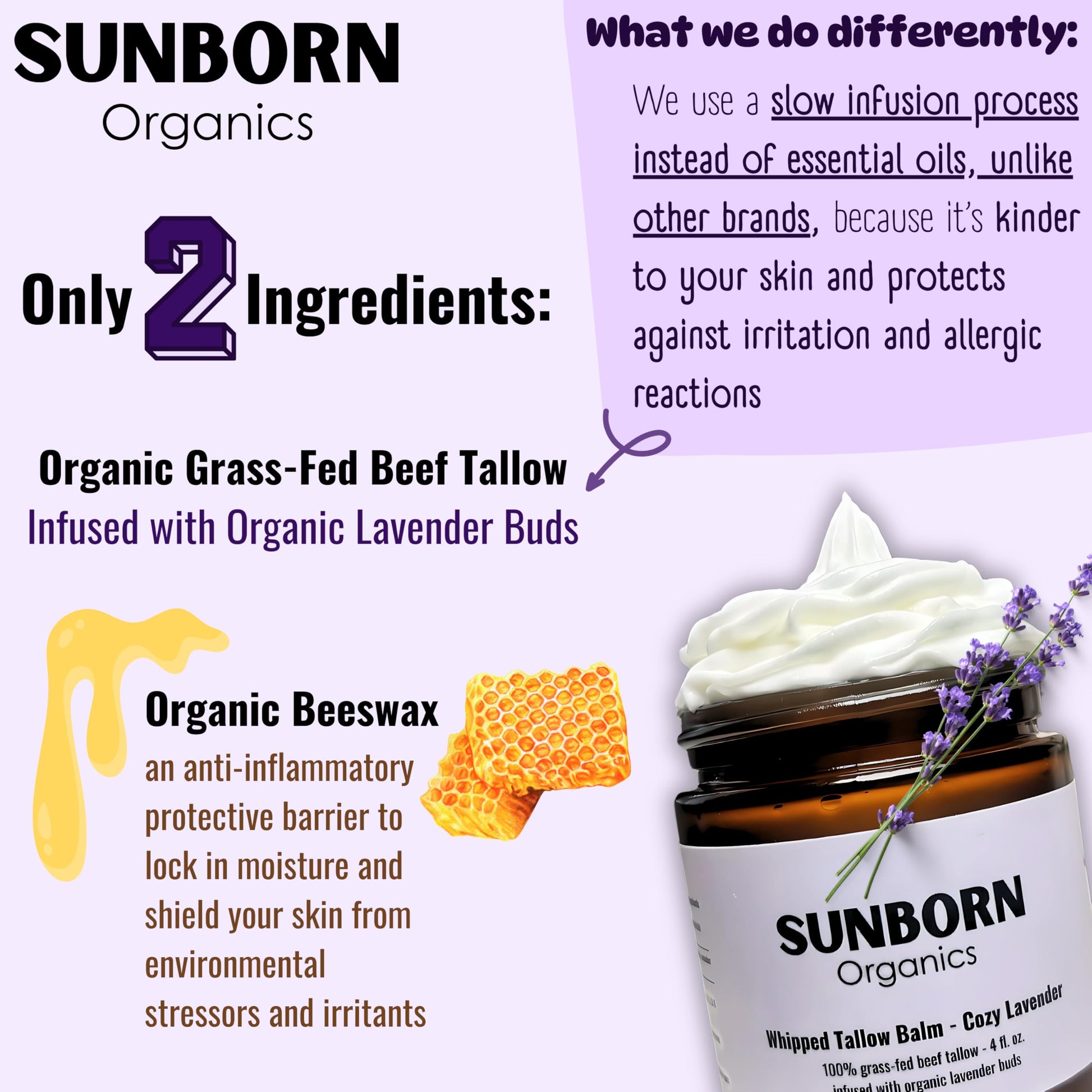 - NATURAL INGREDIENTS: Only pure, organic, 100% grass-fed beef tallow infused with organic lavender buds and organic beeswax. All your skin and body needs for complete nourishment. Free from added oils, chemicals, fragrances, synthetics, dyes or preservatives.