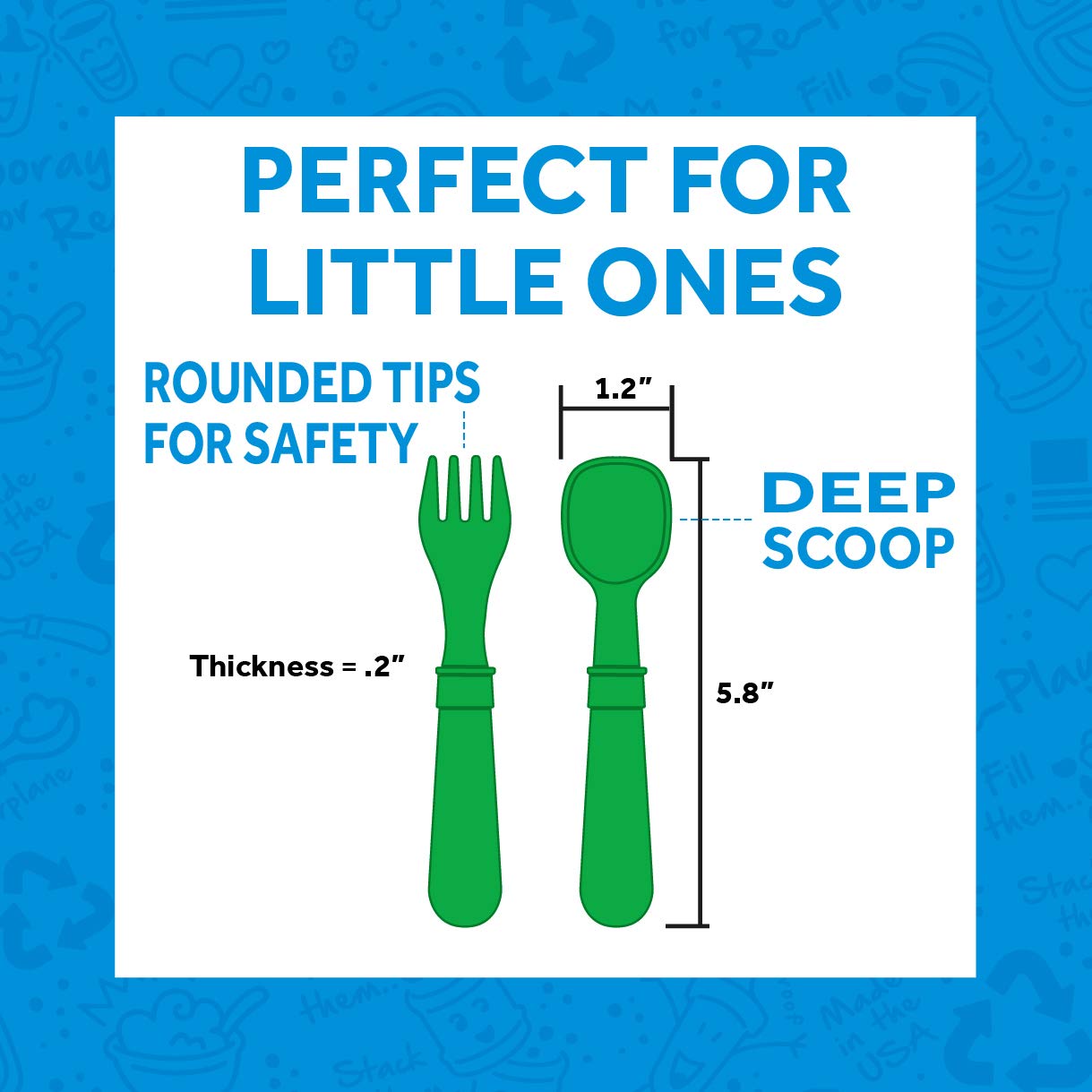 - Sustainable and Reliable: Re-Play's toddler fork and spoon set is made in the USA from recycled milk jugs, making a positive contribution to a more sustainable environment