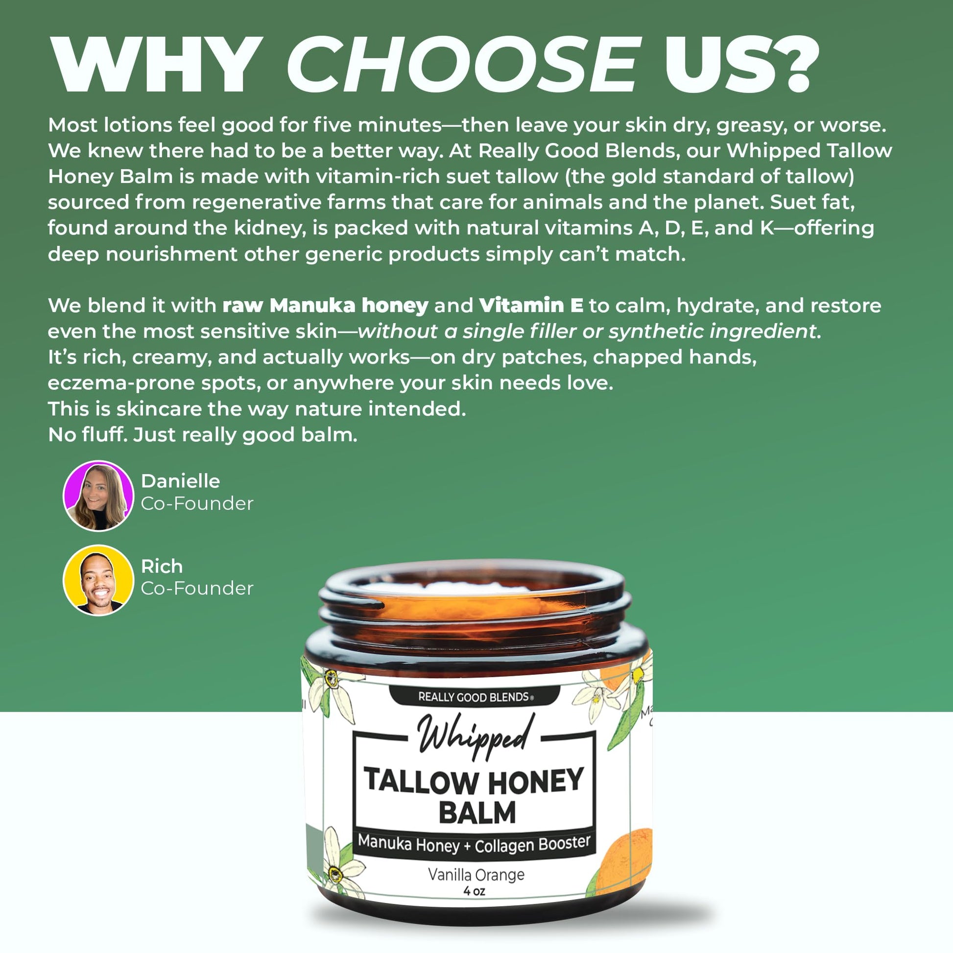 Really Good Blends Whipped Tallow Balm with Manuka Honey – 4 oz | Collagen-Boosting Body Butter | Beef Tallow for Skin | Face & Body Moisturizer | Made in USA (Vanilla Orange)