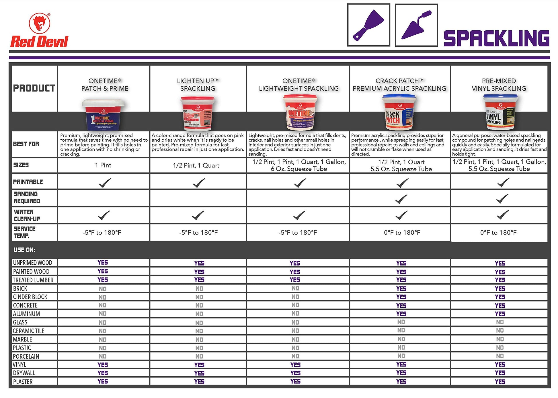 Details: Red Devil ONETIME Lightweight Spackling is the ultimate solution for fast, professional repairs in your home. This versatile, pre-mixed formula is designed to fill dents, cracks, nail holes, and other imperfections in various surfaces, including drywall, plaster, wood, and stucco. Perfect for both interior and exterior use, it spreads easily and dries quickly, allowing you to paint over it within minutes. The lightweight, no-sand formula eliminates the need for time-consuming sanding, while still providing a smooth, professional finish. ONETIME Spackling won't shrink, crack, or flake, ensuring durable, long-lasting repairs. Whether you're patching small holes, fixing medium-sized gaps, or repairing damage before painting, this spackling compound delivers exceptional results. With its easy water clean-up and made-in-USA quality, Red Devil ONETIME Lightweight Spackling is the professional's choice for all your repair needs.