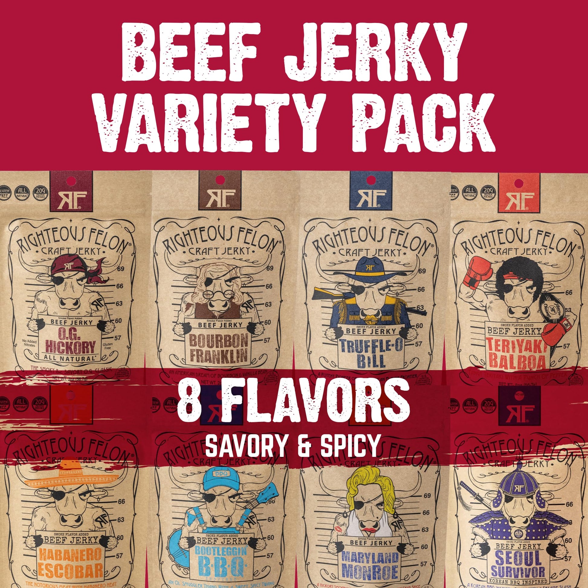 - Jerky Variety Pack: Enjoy the Righteous Felon Beef Jerky Sampler Pack with eight unique flavors for every taste. Savory options include O.G. Hickory, Teriyaki Balboa, Bourbon Franklin, and Truffle-O Bill. For spicy beef jerky, there’s Habanero Escobar, Bootleggin BBQ, Maryland Monroe, and Seoul Survivor.
