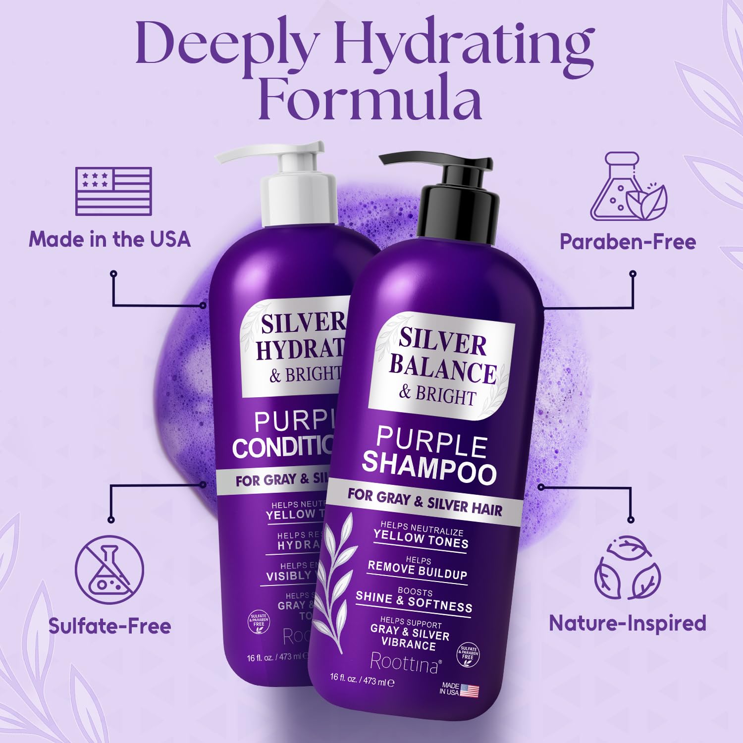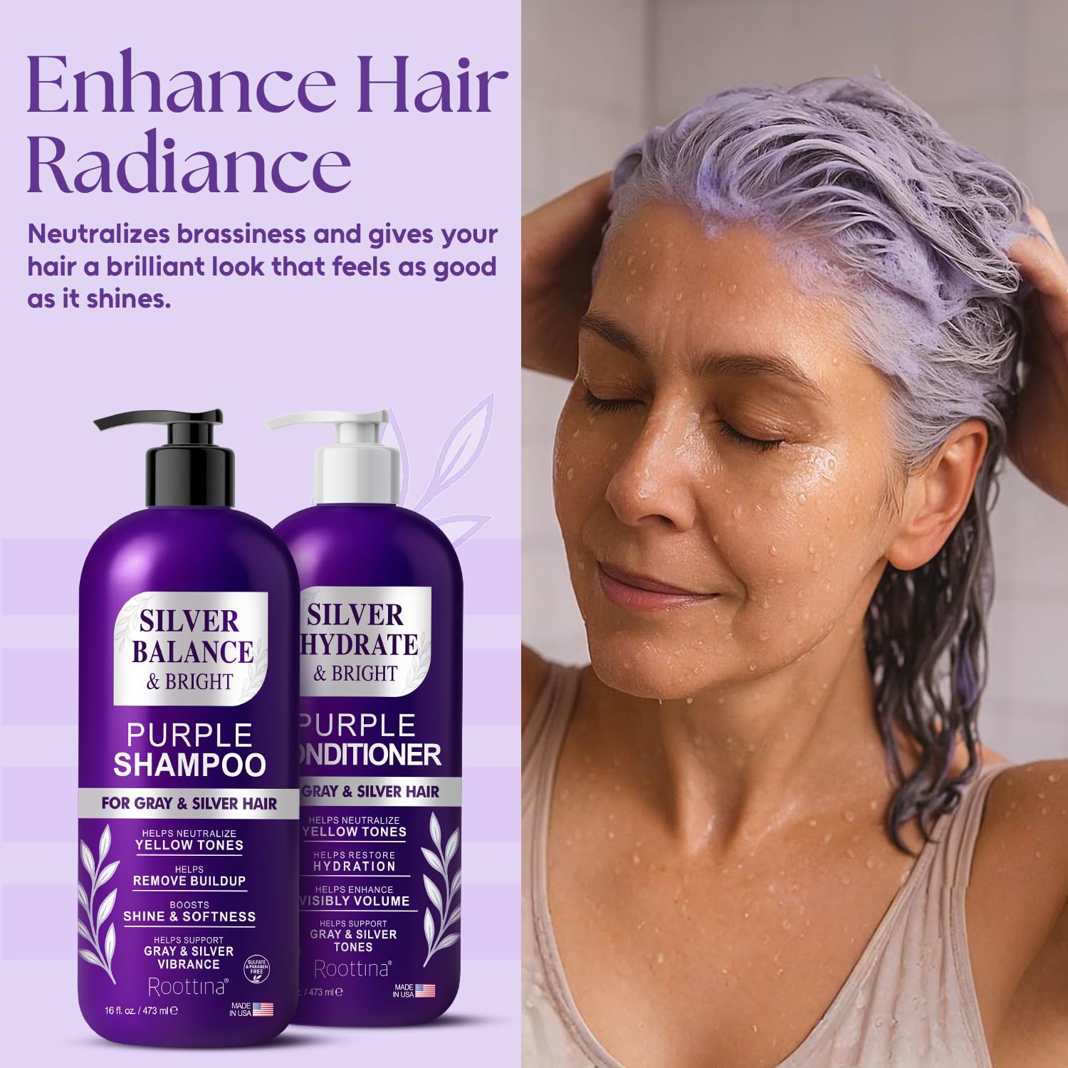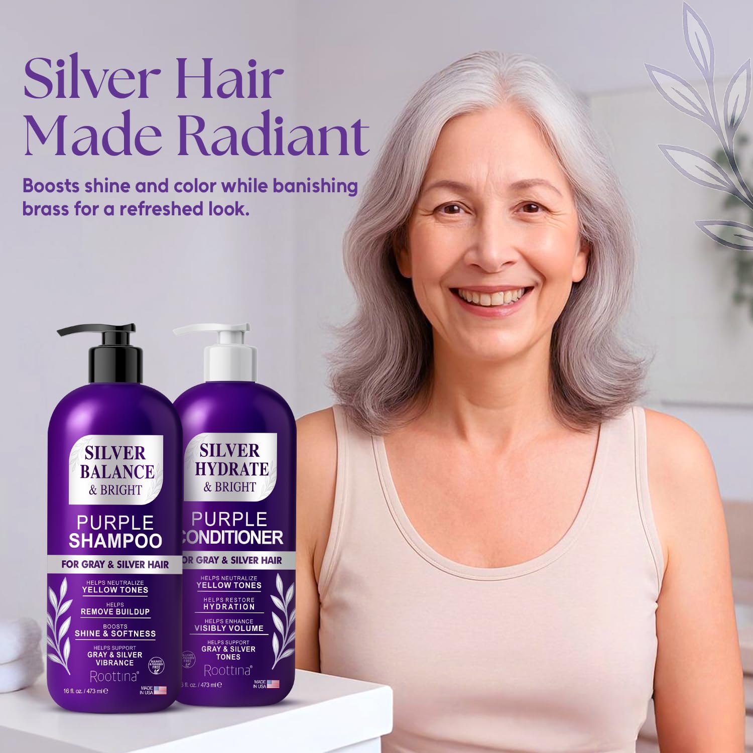 ROOTTINA Purple Shampoo and Conditioner Set for Grey Hair – Silver & White, Balance & Bright, Brass Neutralizing, High Hydration Without Drying Out, Sulfate-Free, Made in USA, 16 fl oz Each