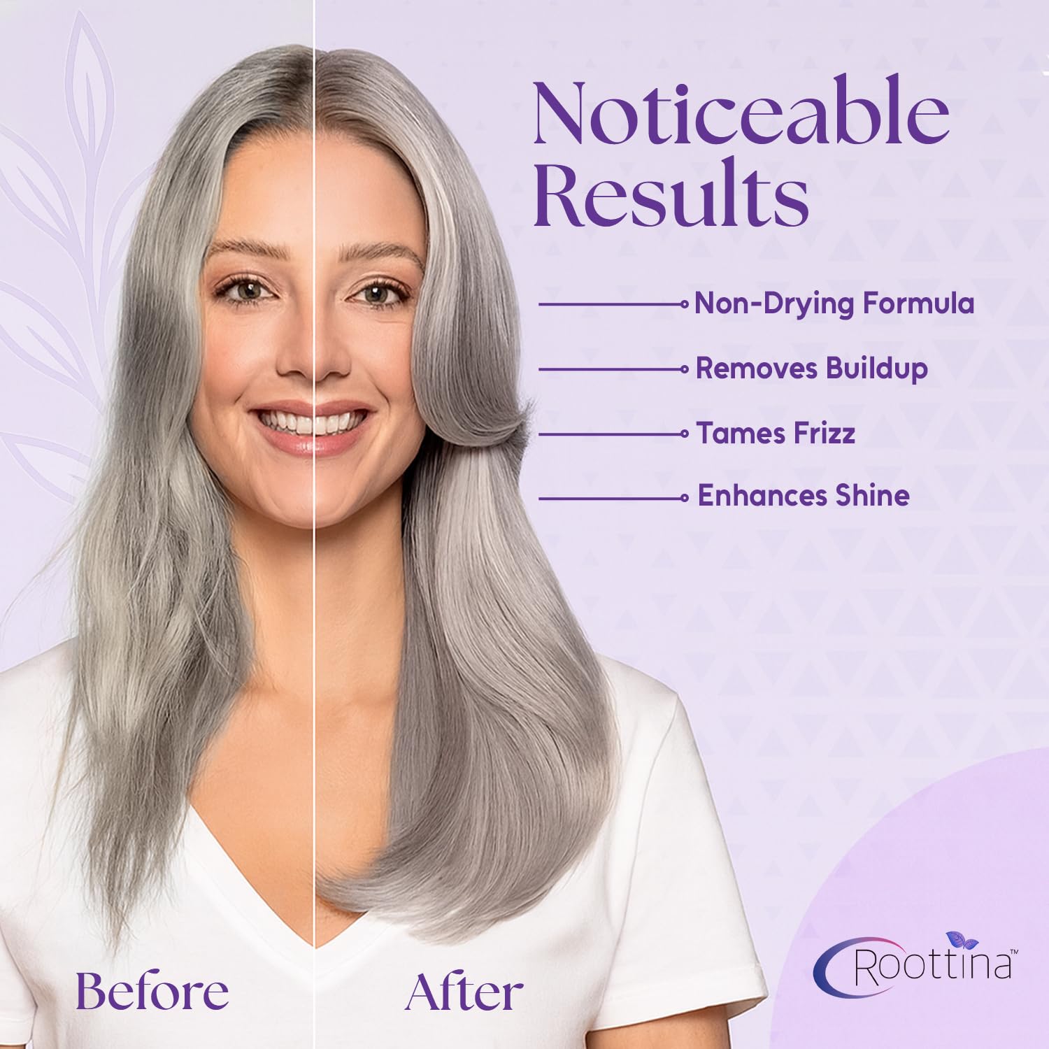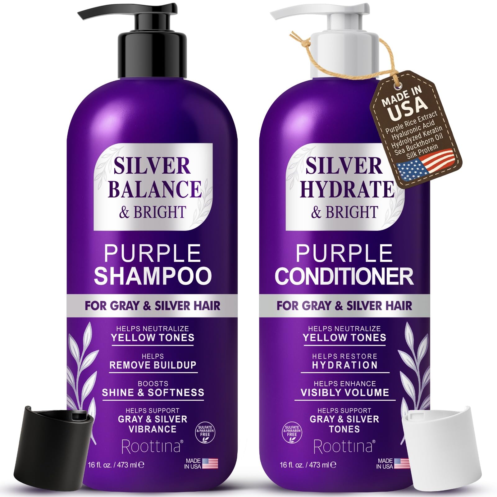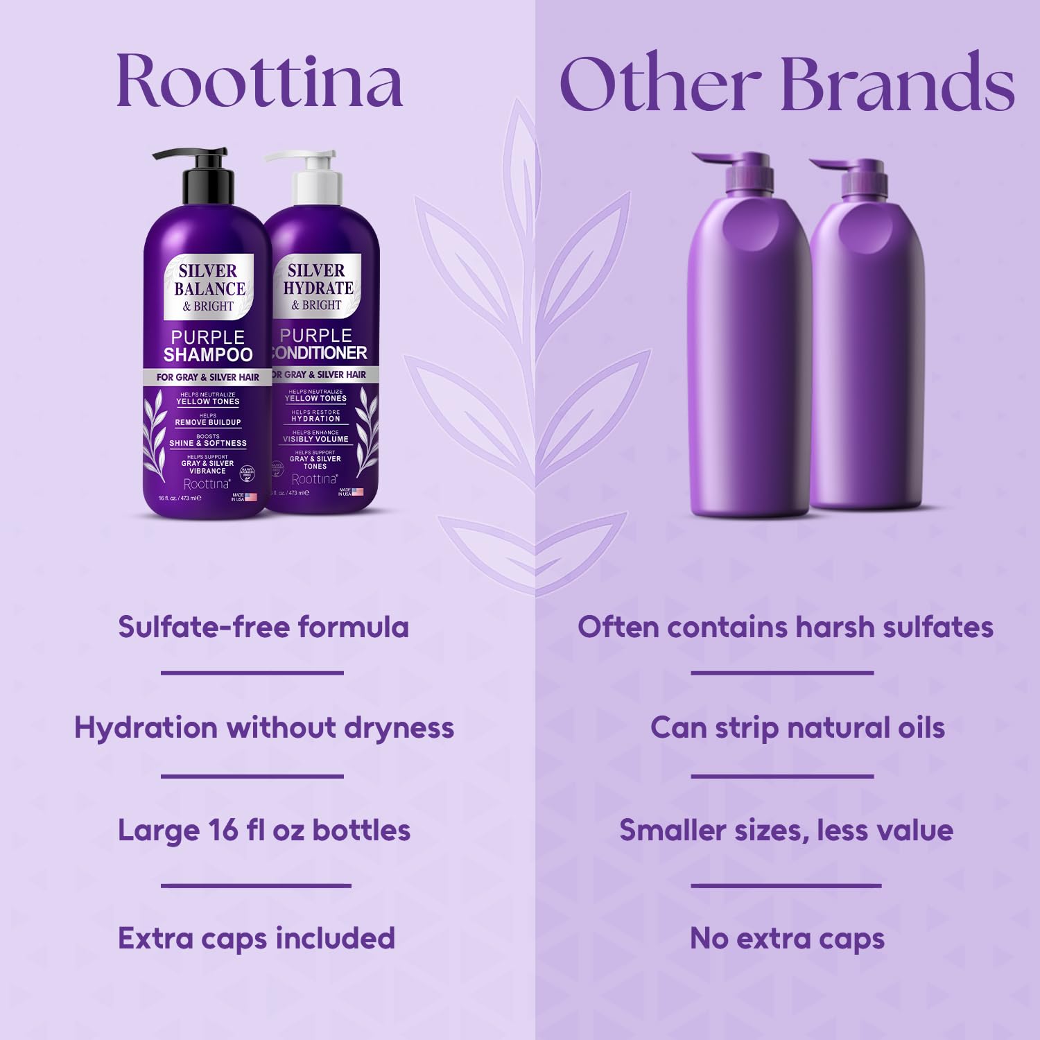 ROOTTINA Purple Shampoo and Conditioner Set for Grey Hair – Silver & White, Balance & Bright, Brass Neutralizing, High Hydration Without Drying Out, Sulfate-Free, Made in USA, 16 fl oz Each