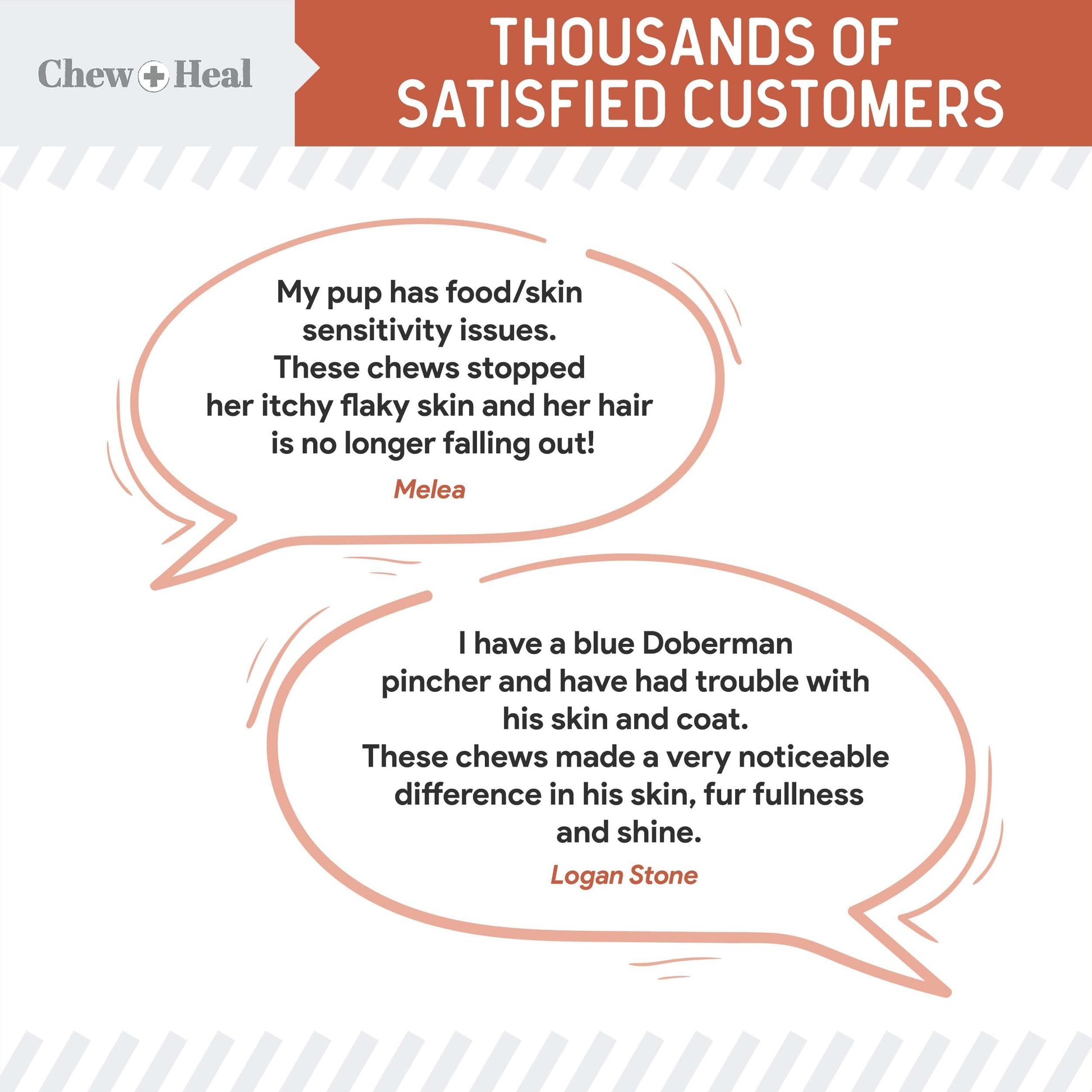 - PREVENTS SKIN ALLERGIES: This anti itch for dogs not only softens the skin, it gives it a glossy shine and helps prevent allergic reactions. This reduces dandruff and itchy skin, helping make your dog feel more comfortable in addition to being healthier! Say goodbye to greasy or dirty coats that have a unpleasant oily smell. These dog bites help kick-start the body’s natural processes to improve fur health.