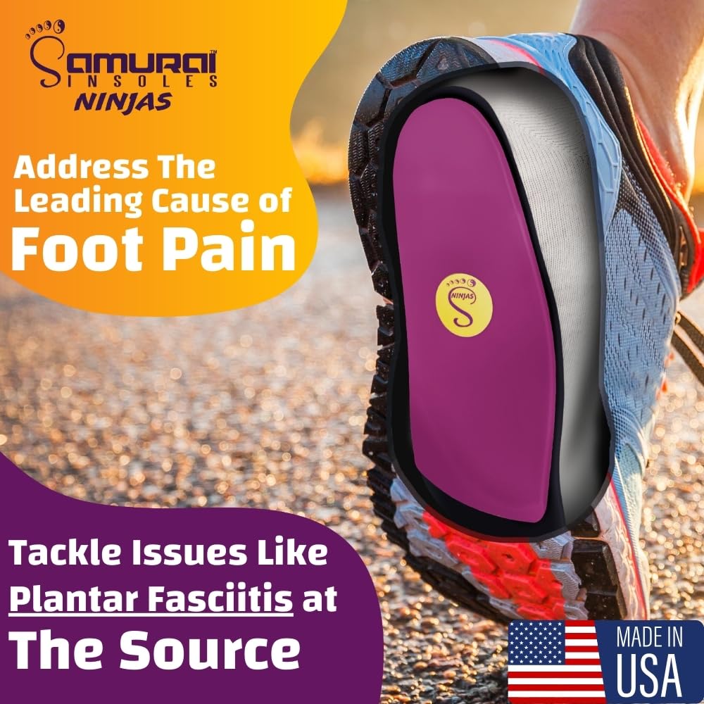 - FOCUSED RELIEF: Samurai Insoles Ninjas are all about that arch. They go after the real cause of plantar fasciitis, heel pain, shin splints, neuromas, tendonitis, and more. Forget cushiony gimmicks - Ninjas provide the solid, springy support that tackles pain at its core. Imagine the relief you'll feel when you finally address the root of your discomfort.