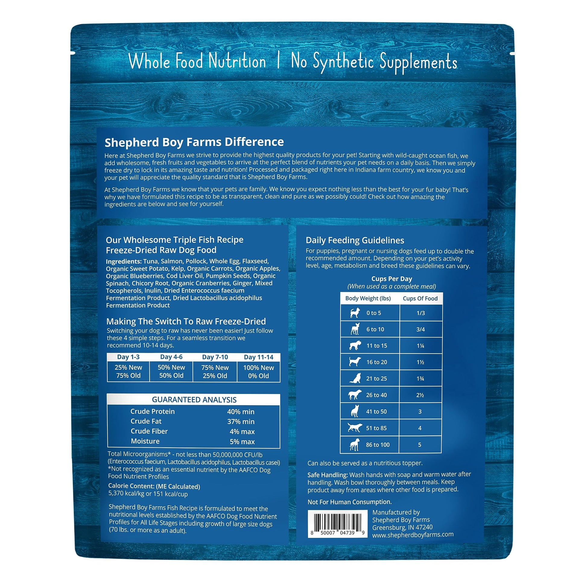Shepherd Boy Farms Freeze Dried Raw Dog Food (Fish Medley Recipe), All Natural Food, 14 oz Bag, Freeze-Dried Dog Food, Made in USA with Organic Produce, High in Protein, Food Topper or Complete Meal
