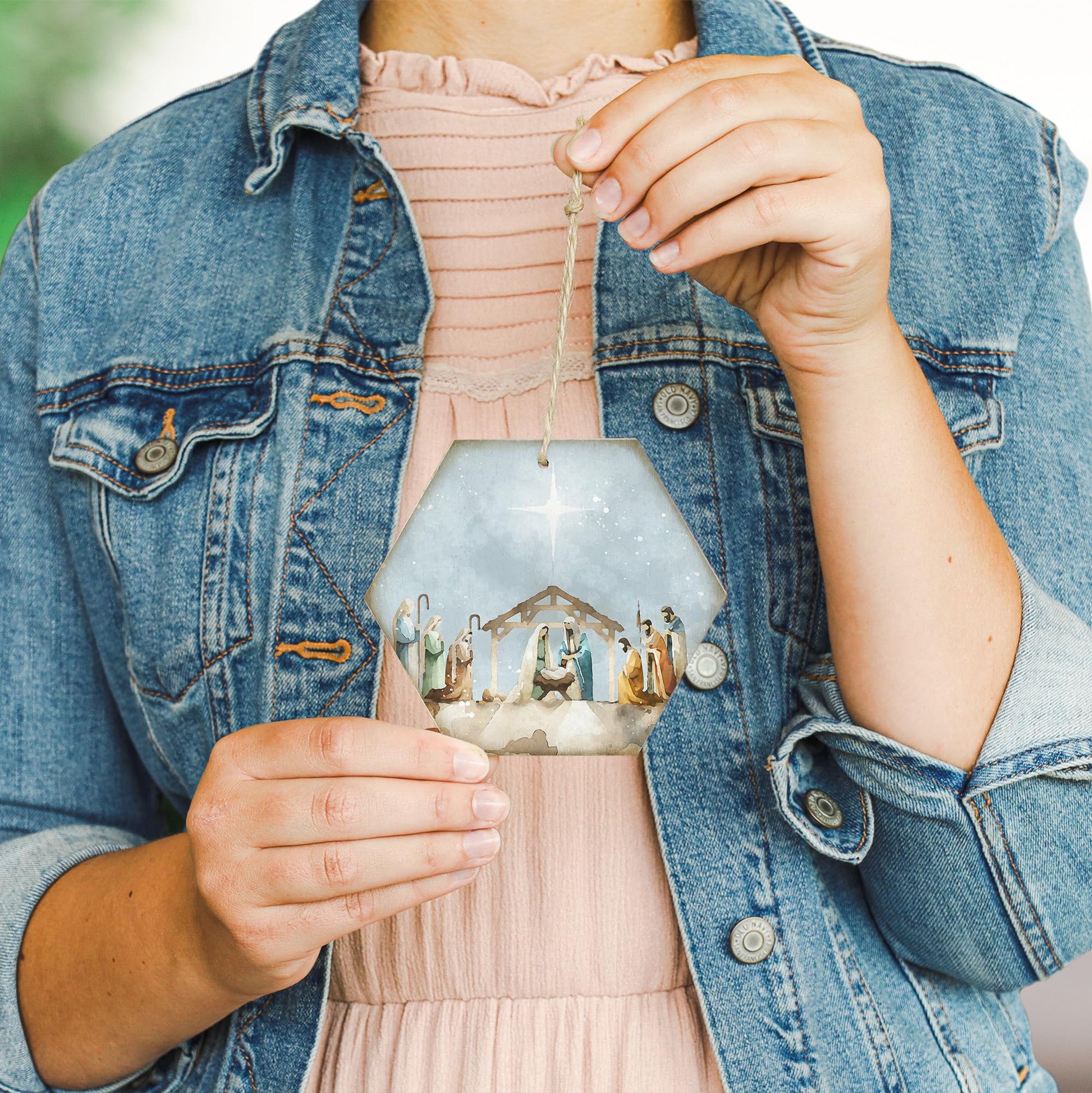 - WOODEN CHRISTMAS ORNAMENT - Beautiful Christmas ornament features a watercolor painting of the nativity scene, celebrating the birth of baby Jesus. Wood Christmas nativity ornament will add rustic charm to your Christmas holiday decor.