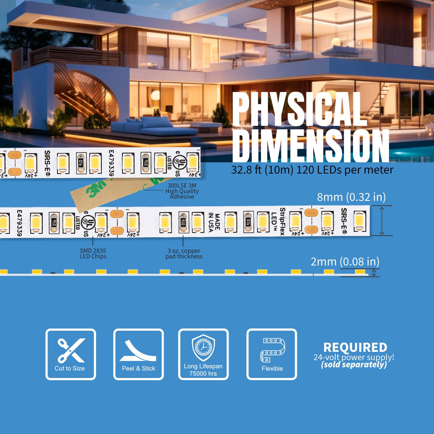 SIRS-E White LED Strip Lights, StripFlexLED Professional Grade Flexible Tape, 24V 120 LEDs/m for Versatile Lighting, Made in USA, UL Listed Soft White 3000K 32.8 ft. 10m