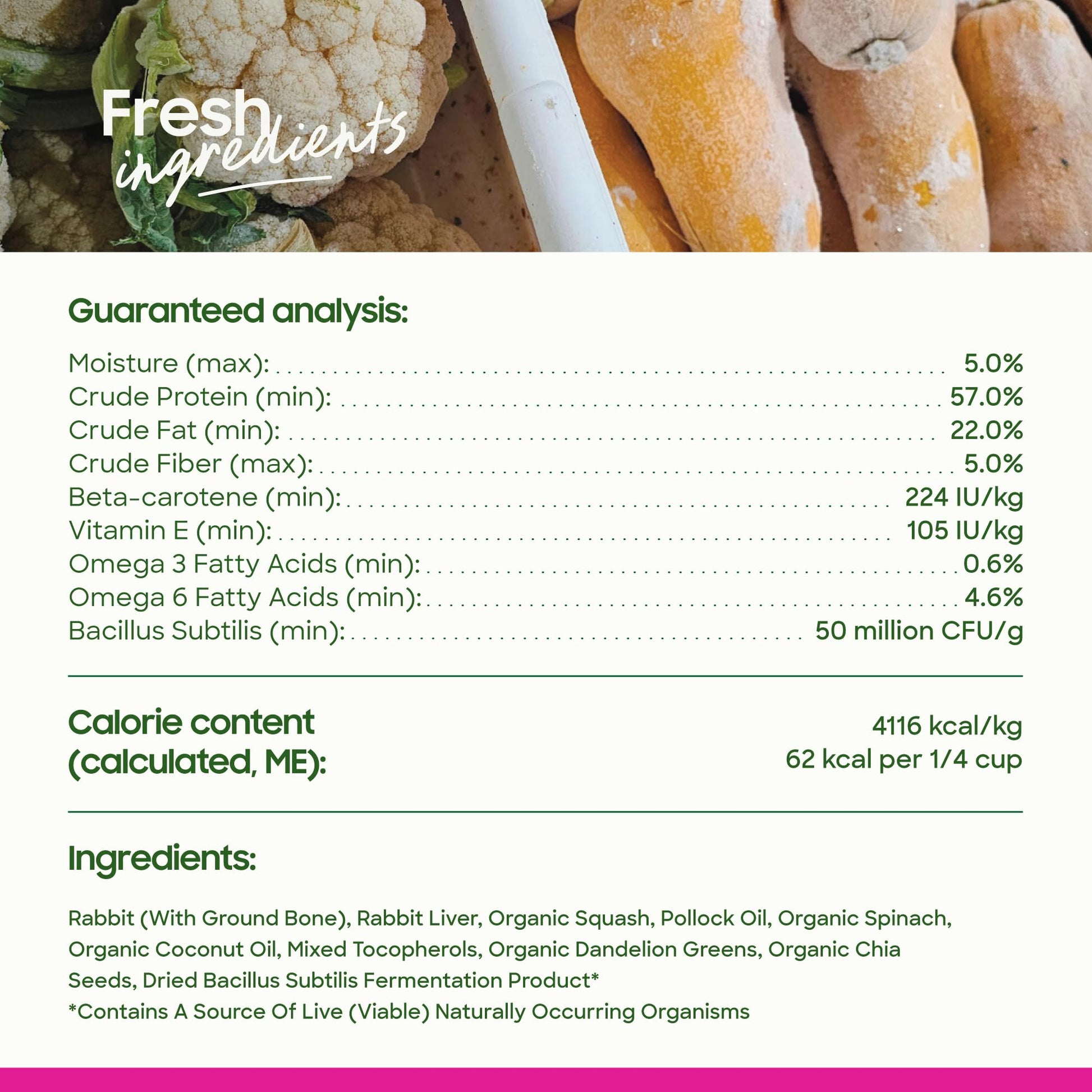 - Freeze-Dried Rabbit Bites: This probiotic cat and dog food topper is made with 95% rabbit, organ, and bone for a quality, protein-rich treat or meal topper.