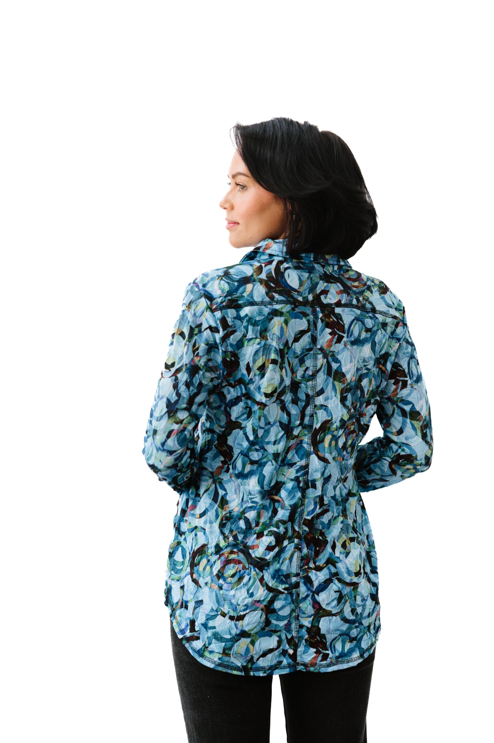 SNO SKINS Fall/Winter Collection Designer Print Crinkle Button-Down Shirt (Denim)