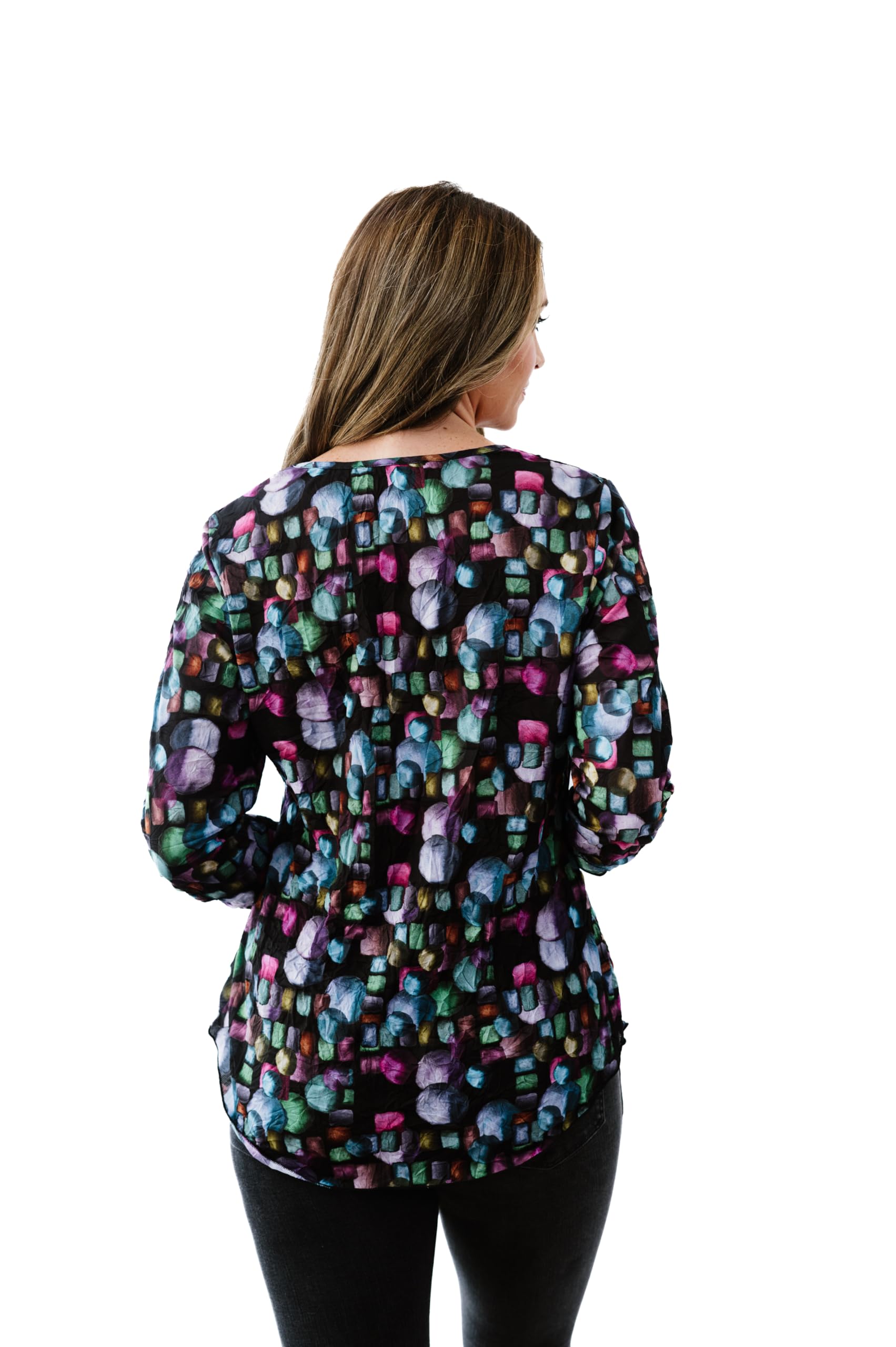 SNO SKINS Fall/Winter Collection Designer Print Crinkle V-Neck Top with Rouched Detail (Galaxy)
