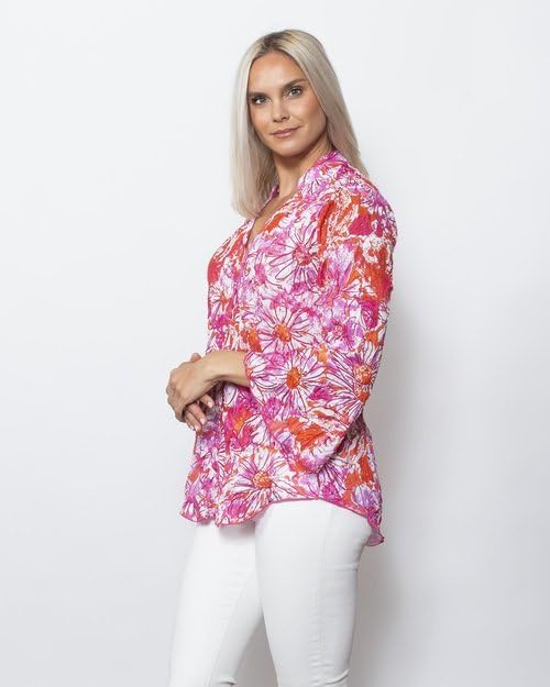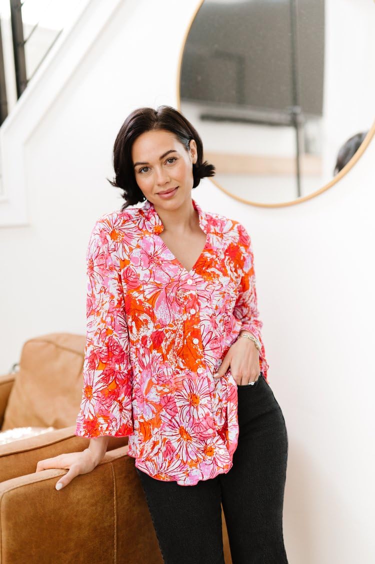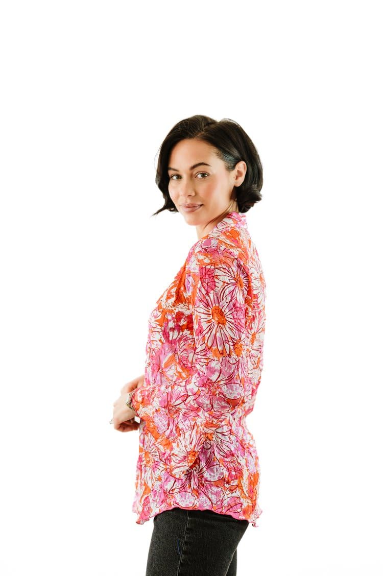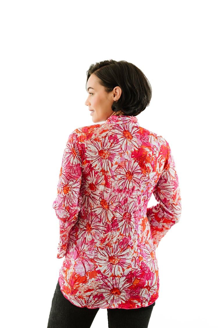 - Each designer top undergoes a highly specialized process to create the unique finish and feel of our signature crinkle design. This sweetheart button blouse features flouncy sleeves and a stand collar