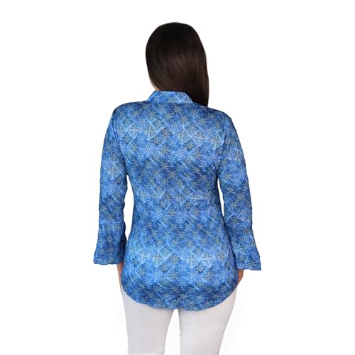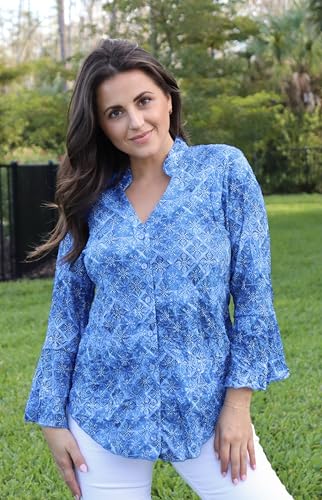 • Each designer top undergoes a highly specialized process to create the unique finish and feel of our signature crinkle design. This sweetheart button blouse features flouncy sleeves and a stand collar