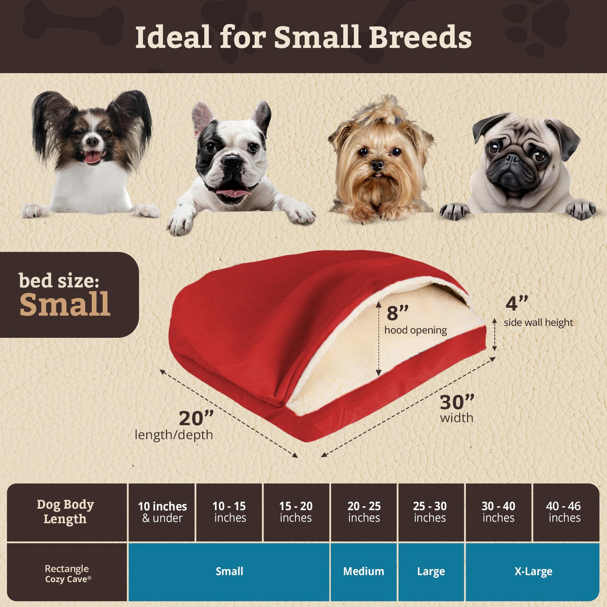 - SIZING: This Small Rectangle Cozy Cave measures 20” x 30” and has an approximate hood opening height of at least 12”. A thin removable plastic tube keeps the hood open for easy entry or exit and can be removed through the small hole at the corner of the hood for a looser, blanket-like structure. This size Small provides space for small breeds while creating a snug, enveloping feel.