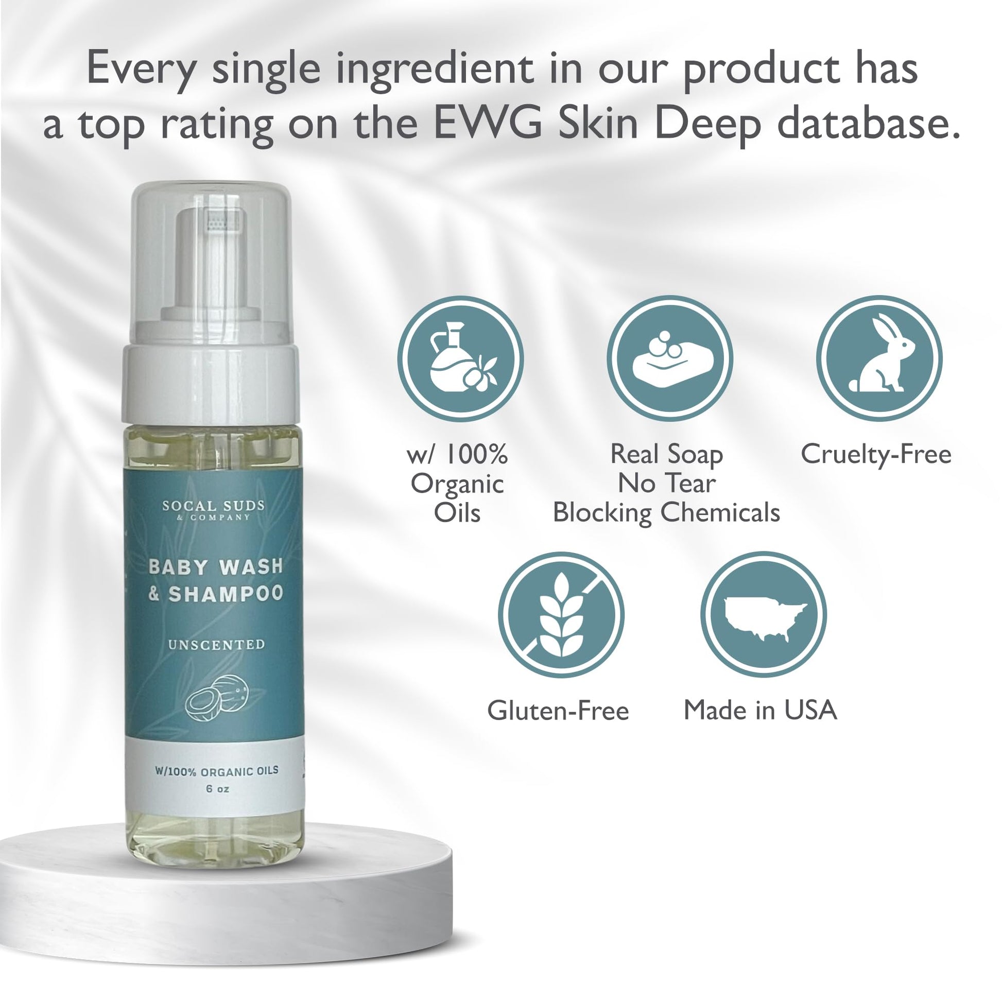 - GENTLE CARE IN EVERY BUBBLE: SoCal Suds & Company's foaming organic baby wash and shampoo features saponified oils of organic sunflower and coconut. This gentle formula is enriched with distilled water, organic vegan glycerin, and rosemary extract, offering a nurturing cleanse that honors the delicate balance of any skin type. Embodying our commitment to natural and organic care.