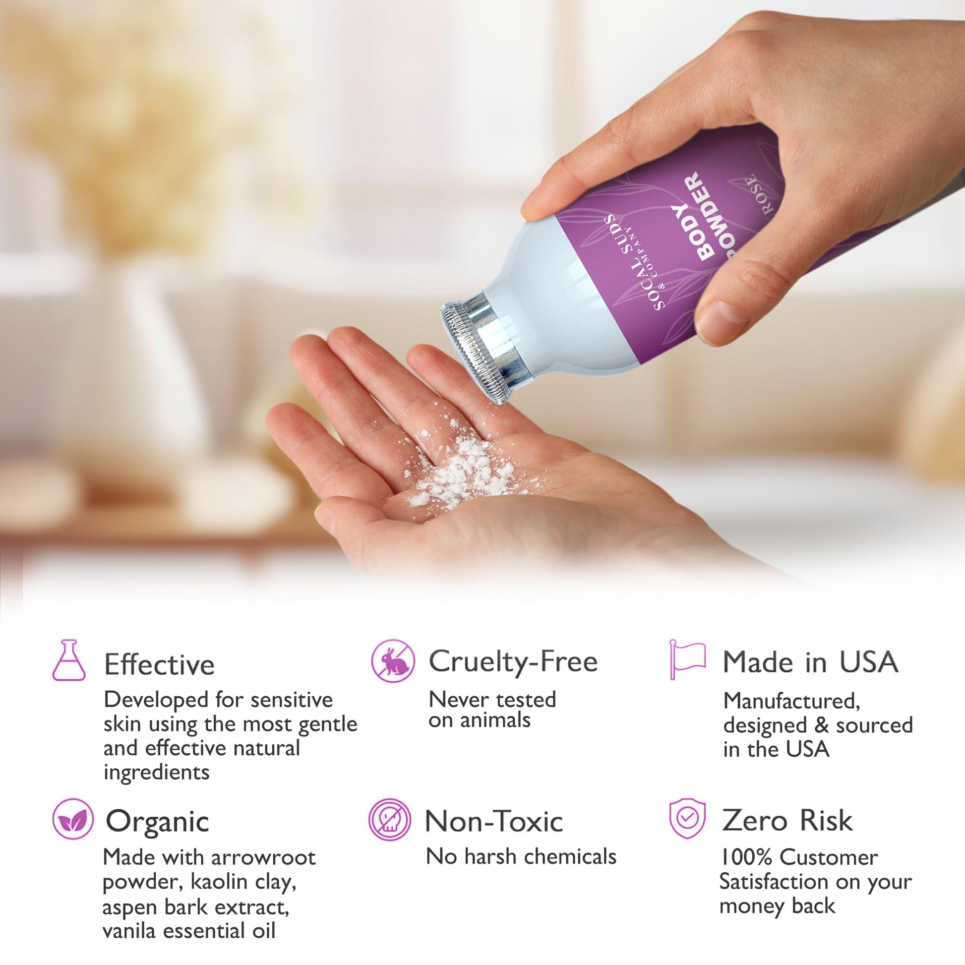 - NATURE'S GENTLE TOUCH: Our Rose-scented body powder, conveniently sized at 4oz, provides gentle care for sensitive skin of all ages. SoCal Suds & Company's formula combines pure Arrowroot Powder and Kaolin Clay for natural absorbency and softening, with Aspen Bark Extract for added skin support. This talc-free powder helps maintain skin's natural balance, making it ideal for anyone seeking a nurturing, natural skin wellness solution.