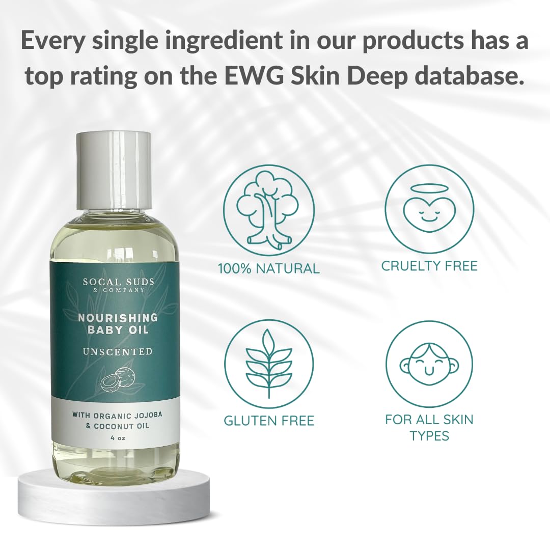 - NATURE'S CARE IN EVERY DROP: Our Fragrance Free, thoughtfully packaged 4oz baby oil travel size is a nurturing companion for your infant's daily routine. SoCal Suds & Company's infant essentials are imbued with the purest ingredients, featuring fractionated Coconut Oil and Organic Jojoba for lightweight moisture, Meadowfoam Seed Oil, and Sunflower Oil for delicate care. Enriched with Non-GMO Vitamin E, this formula is our homage to uncompromised organic and natural baby oil skincare.
