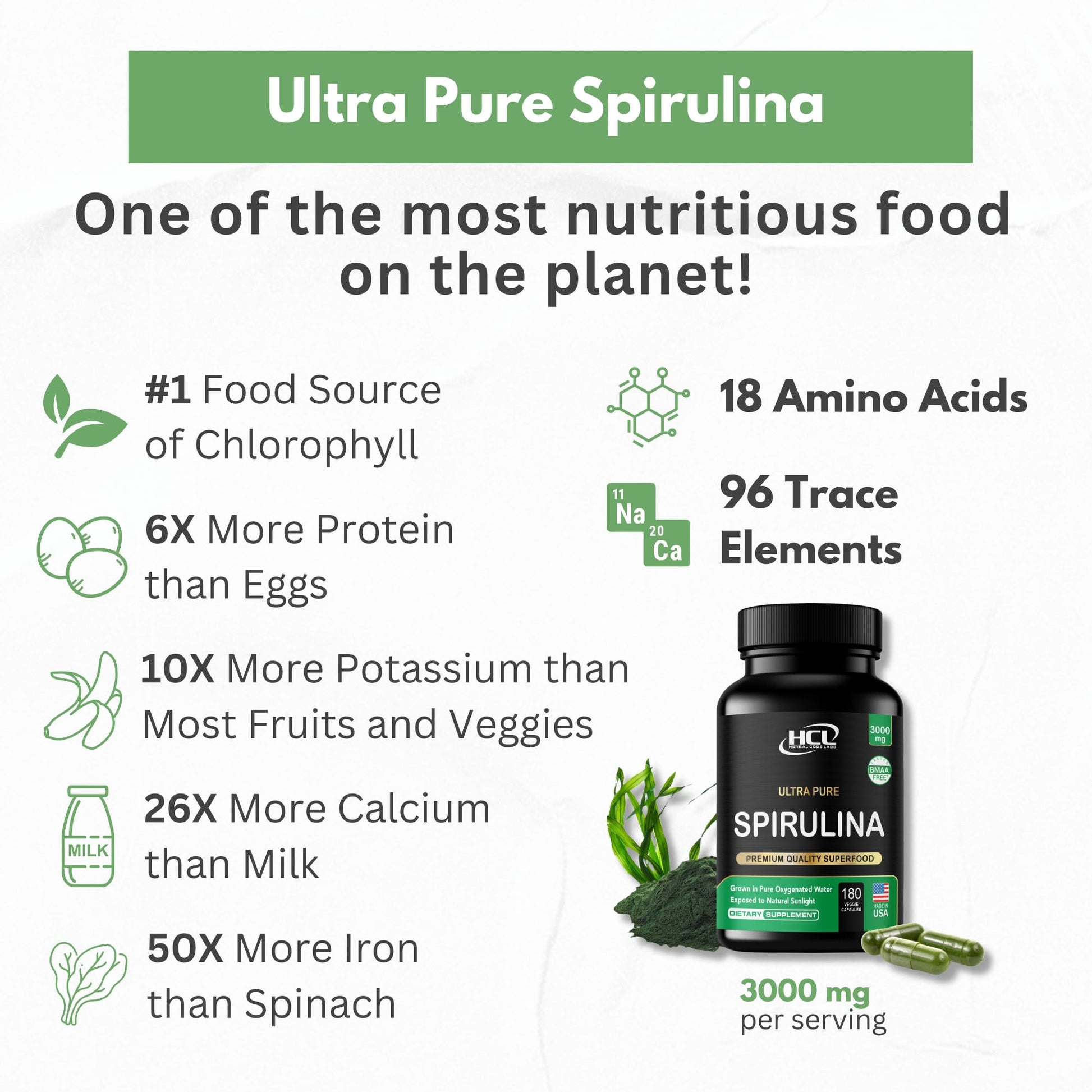 - THE MOST NUTRIENT DENSE VEGAN SUPERFOODS ✔ Our 3000 mg per serving of spirulina will produce some of the best detox and nutrition results. It is full of proteins, vitamins, minerals, antioxidants, and chlorophyll. Spirulina energize you from within.*