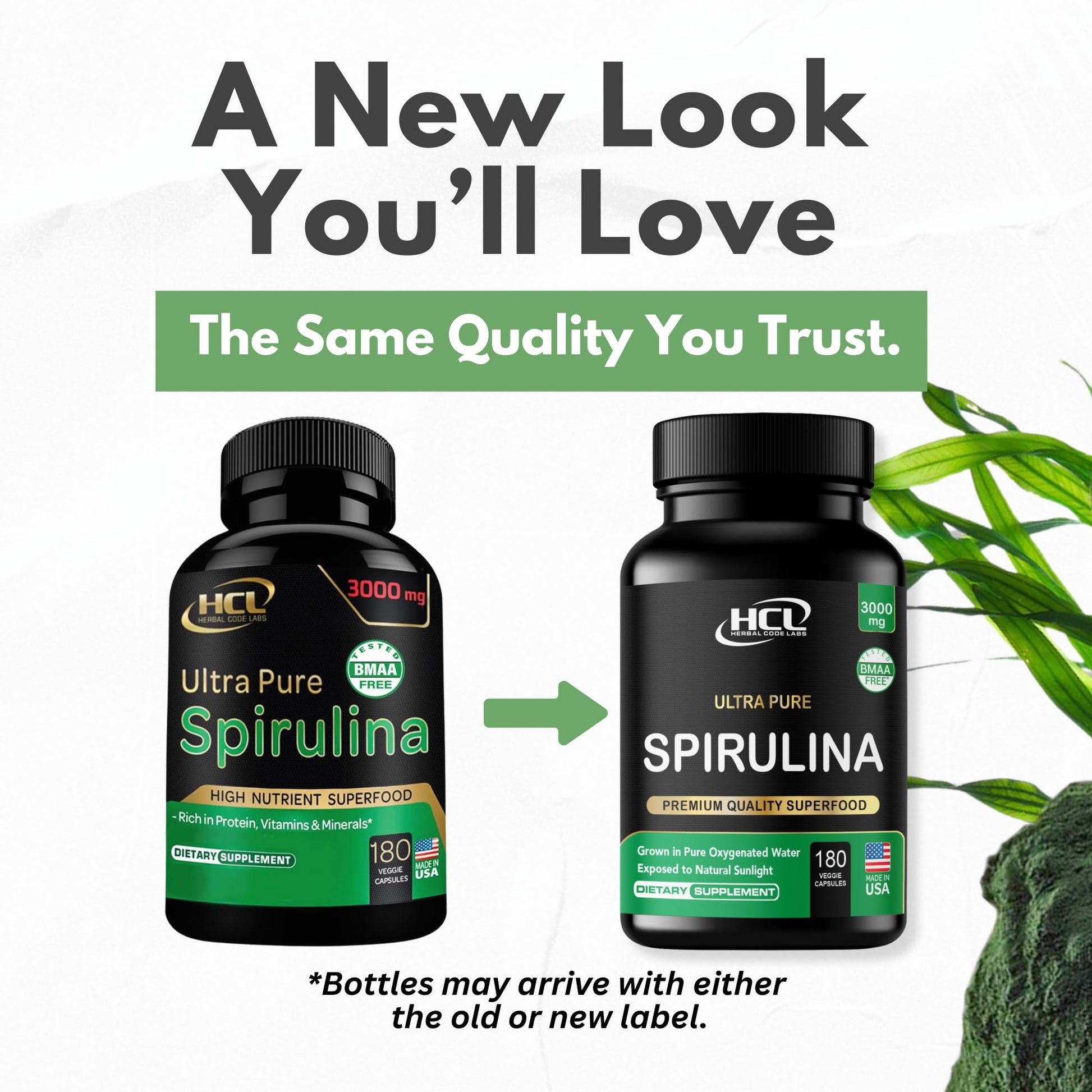 Spirulina Powder Capsules 3000 mg - Purest Non-Irradiated Blue Green Algae - Best Raw Vegan Protein - Green Superfood - Natural Multivitamins – 180 Pills Made in The USA