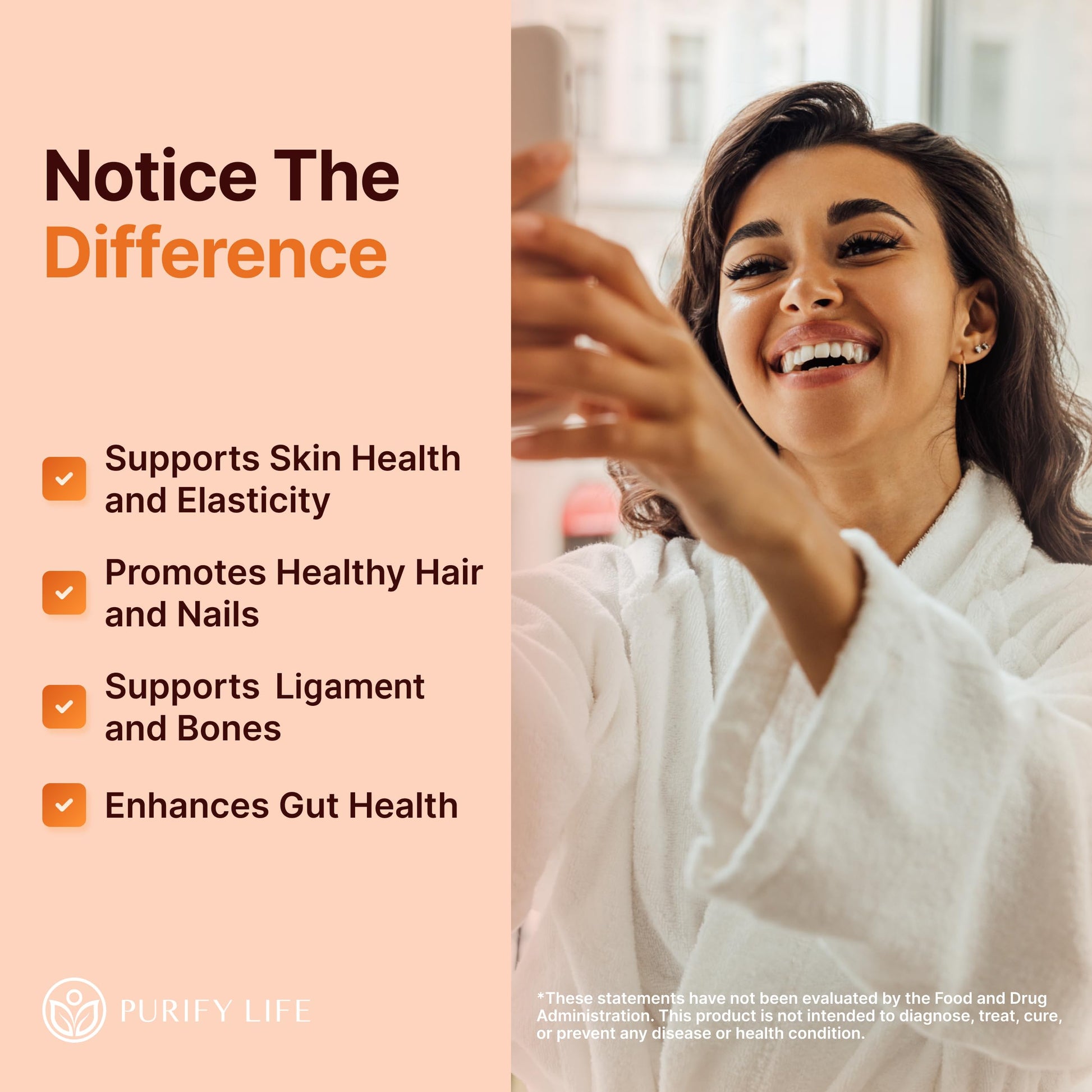 - [Healthy Hair, Skin, Nails]: Rejuvenate the skin and gain a glow with this collagen peptide in your diet, delivering tighter skin and smaller pores. Enjoy healthier hair, stronger nails, glowing skin and youthful complexion with our collagen supplements for women and men. For best results, couple these with our Biotin Gummies by Purify Life.