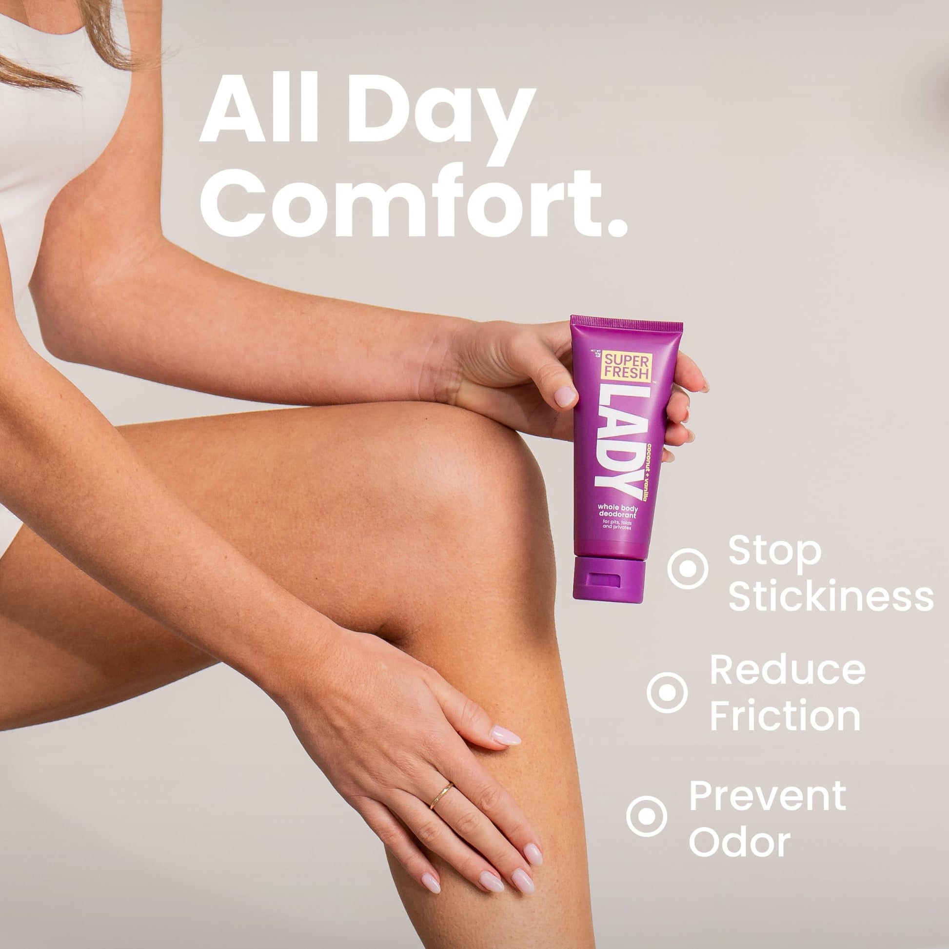 - MOISTURIZE, HYDRATE, AND PROTECT: No more bra-line break-outs or "down there" odor. Super Fresh Lady Parts body deodorant for women will keep your skin moisturized, comfortable, and smelling fantastic. Can also be used as a whole body odor eliminator for women - great for feet, underarms, skin folds, and under breast deodorant.