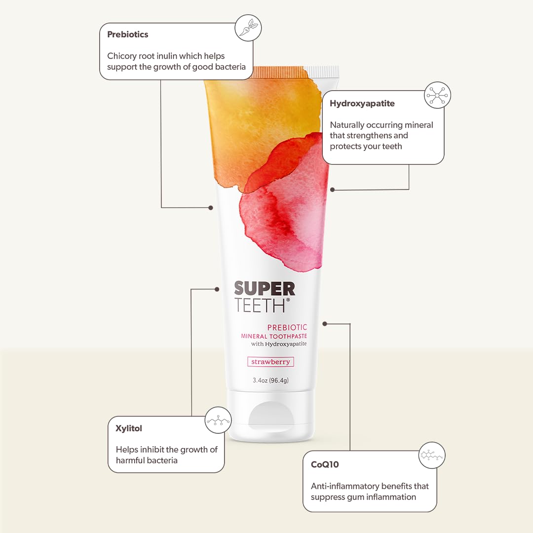 - STRENGTHEN AND PROTECT YOUR TEETH: SuperTeeth Prebiotic Mineral Toothpaste uses the power of naturally derived hydroxyapatite (a mineral that makes up 97% of your enamel) to strengthen and protect your teeth while delivering prebiotics and CoQ10 to reduce inflammation and support the health of your mouth.