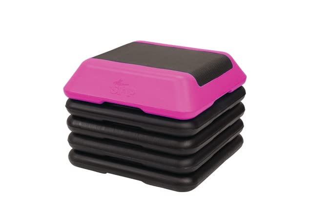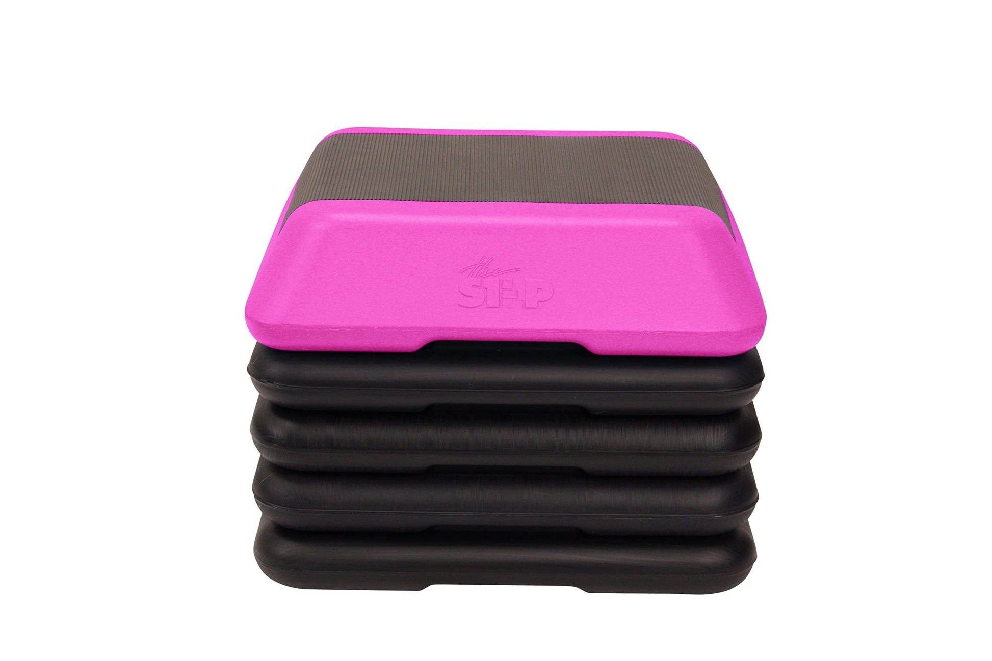 Details: Get more from your workout while minimizing space with The Step High Step. The Step is a great home-fitness tool for beginners to experts and is customizable for a variety of aerobic and strength exercises. This system includes a pink High Step platform and 4 original risers to create the foundation of any workout program. The platform features one (1) 13" x 9" stepping surface and four (4) risers (16" L x 16" W x 2" H). These sturdy risers can be used on any type of indoor flooring from carpet to concrete without leaving behind scratches. Burn more calories the higher you step with 4" to 6" to 8" to 10" to 12" platform height options using the included risers. Each High Step and riser are made with four nonskid feet to prevent sliding or moving during exercise. The risers and platform also feature a resistance band notch, which safely holds the band in place. Crafted from durable, recyclable high-density polyethylene that supports up to 275 pounds (or up to 400 lbs. with risers). This product is backed by a 90-day manufacturer's warranty period.