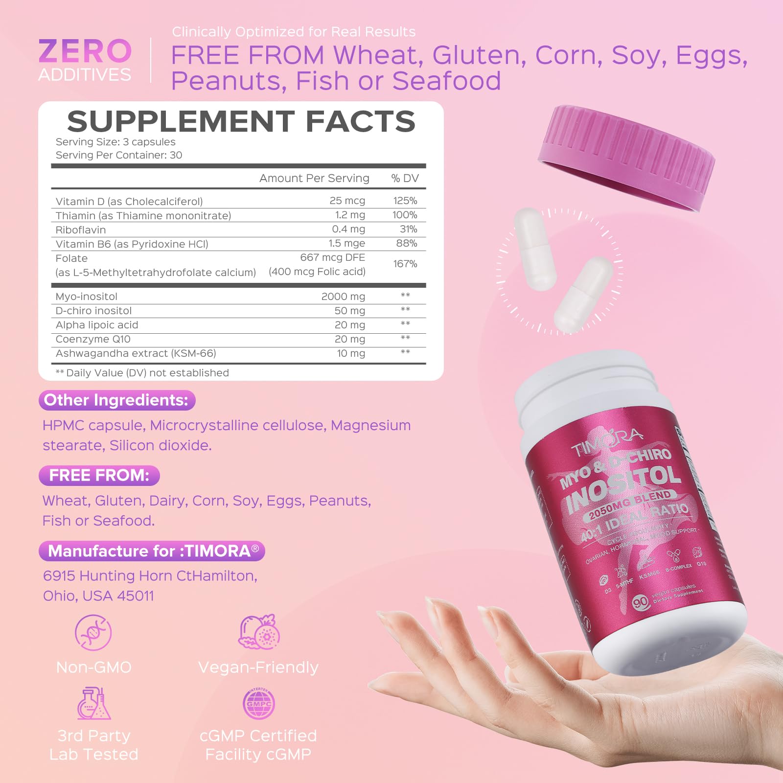 TIMORA 14-in-1 Myo-Inositol & D-Chiro Inositol Supplement for Women, Targeted 40:1 Ratio Plus Folate (5-MTHF) for Regular Cycles, Hormone Balance & Ovarian Support with KSM66 Ashwagandha, Vitamins D3