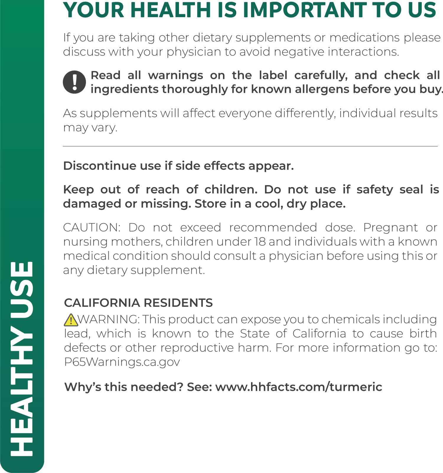 - With 95% Curcuminoids: These are the main active compounds in Turmeric Powder which give it its helpful properties. Healths Harmony Turmeric capsules include 150mg of Curcumin standardized to 95%, which is more than you may find elsewhere.