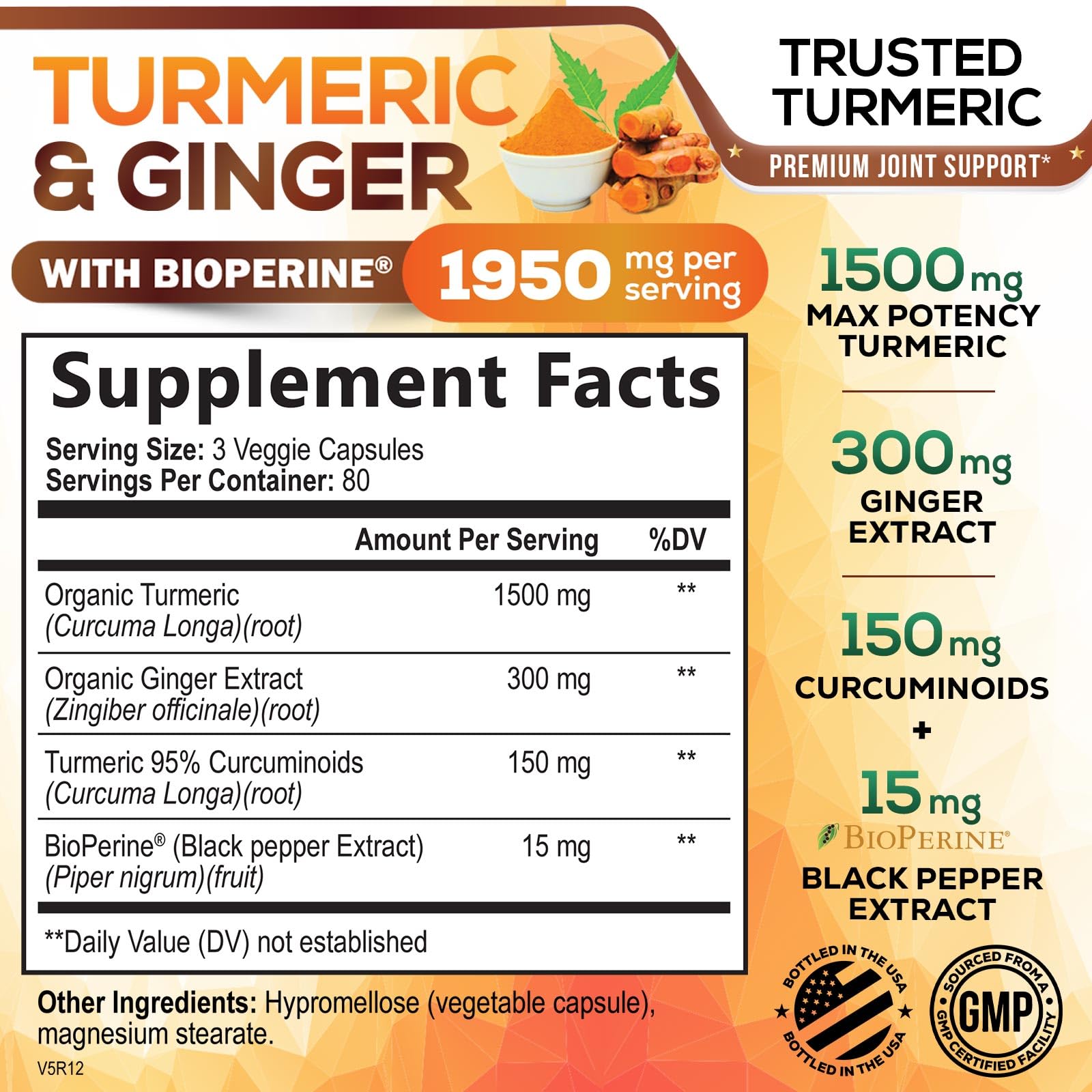 Turmeric Curcumin Supplement 1950mg with Organic Turmeric & Ginger, 95% Curcuminoids, BioPerine Black Pepper for Best Absorption, Nature's Vegan Joint Support, Non-GMO, Bottled in USA